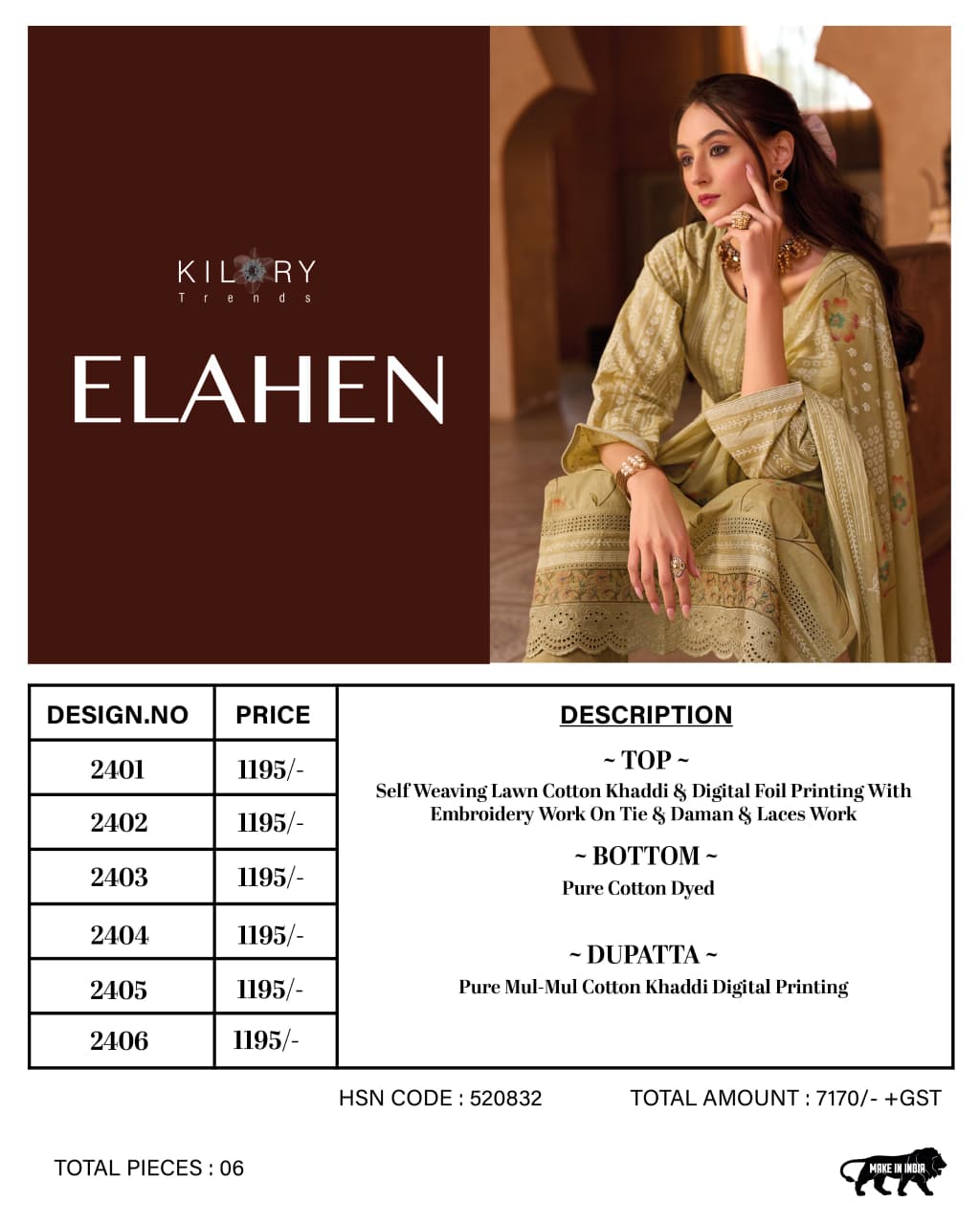 | Catalog Name | Kilory Elahen Lawn Cotton Designer Salwar Kmaeez Collection |