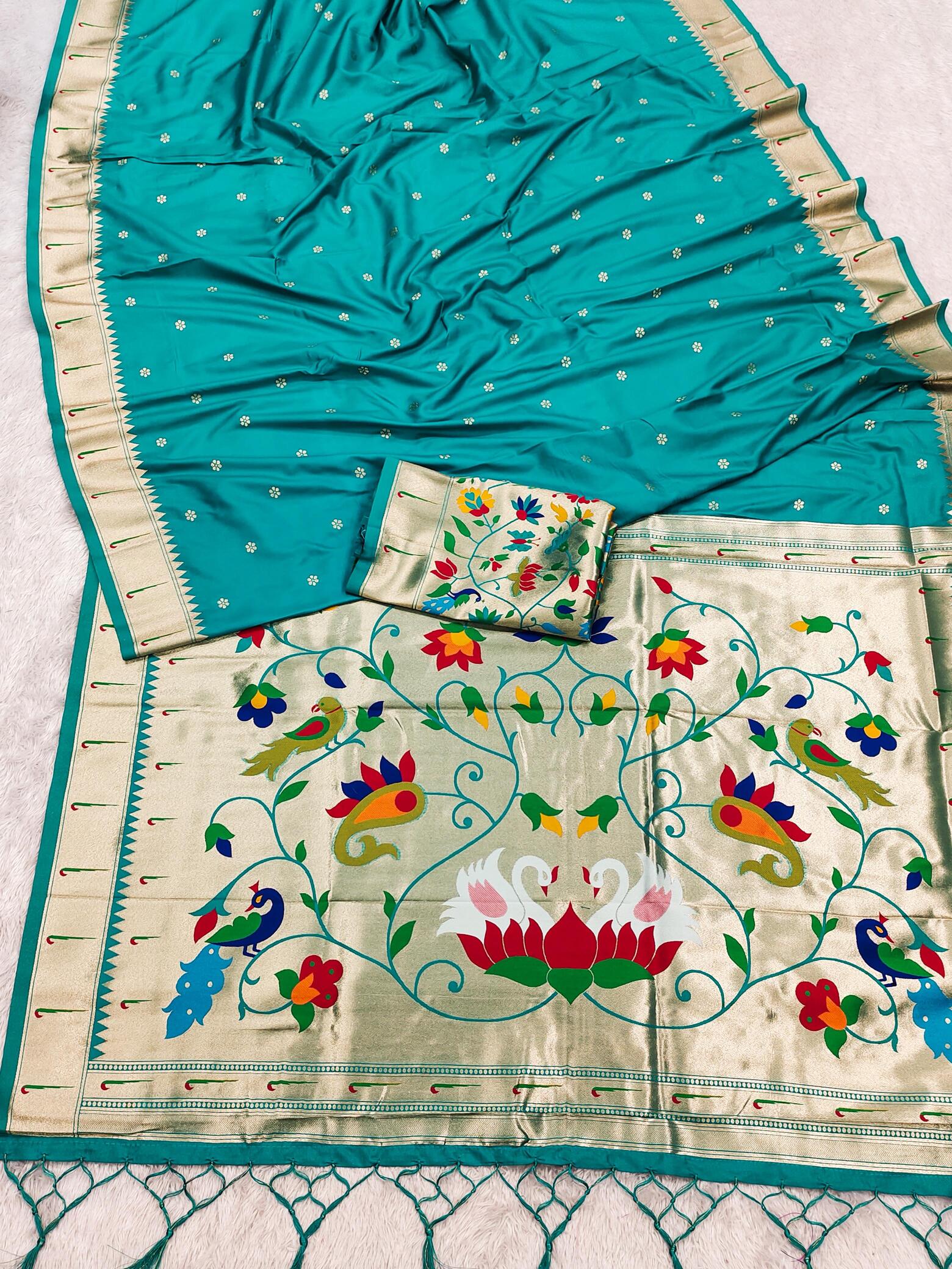 | Fabric Description | Saree :- Paithani Silk | Pattern:- Embellished | Work:- Golden Zari & Meenakari Threads Unique Motifs | Blouse :-Silk Weaving Brocket Blouse Piece With Sleeve Border |