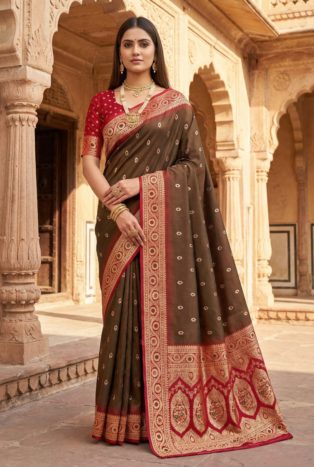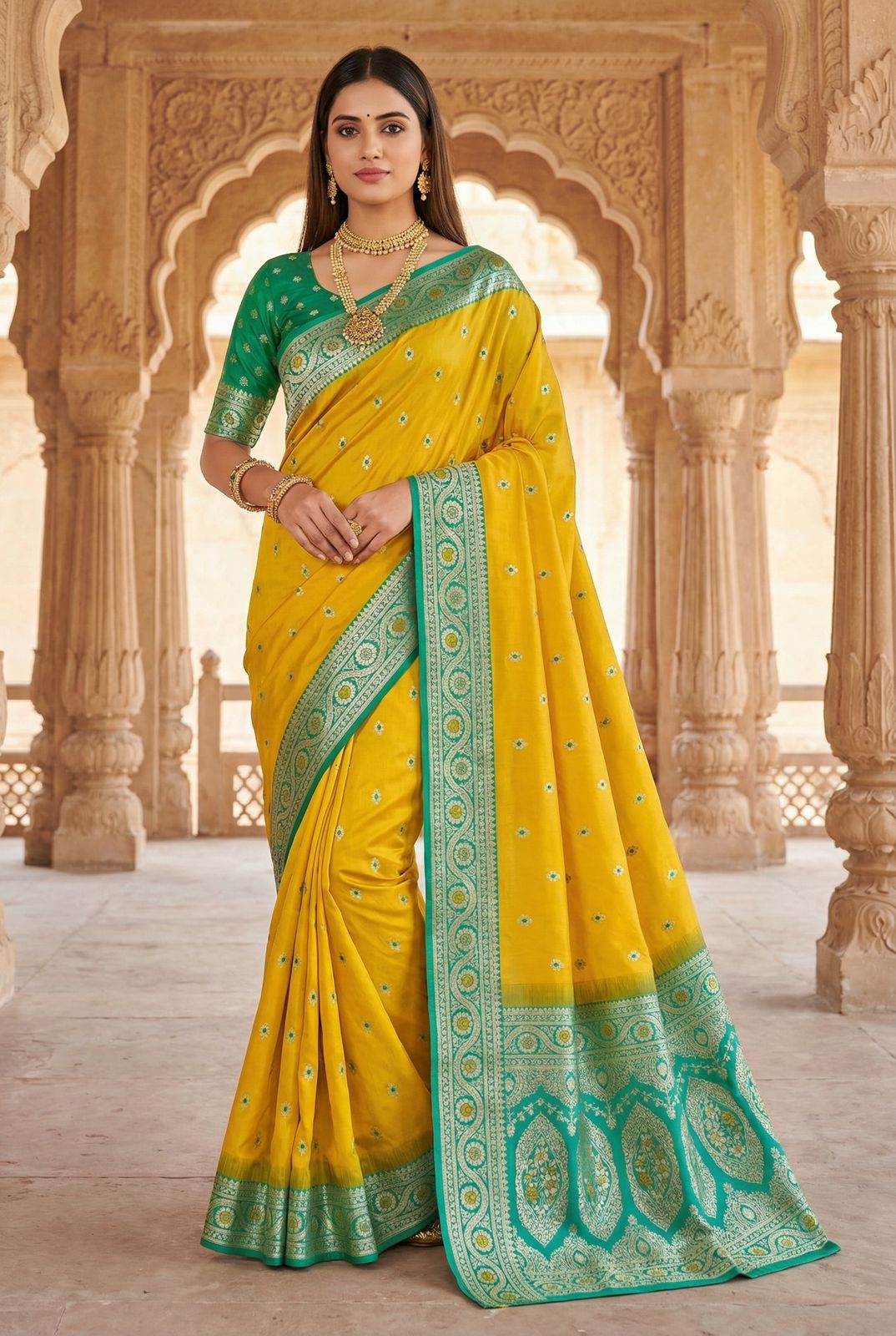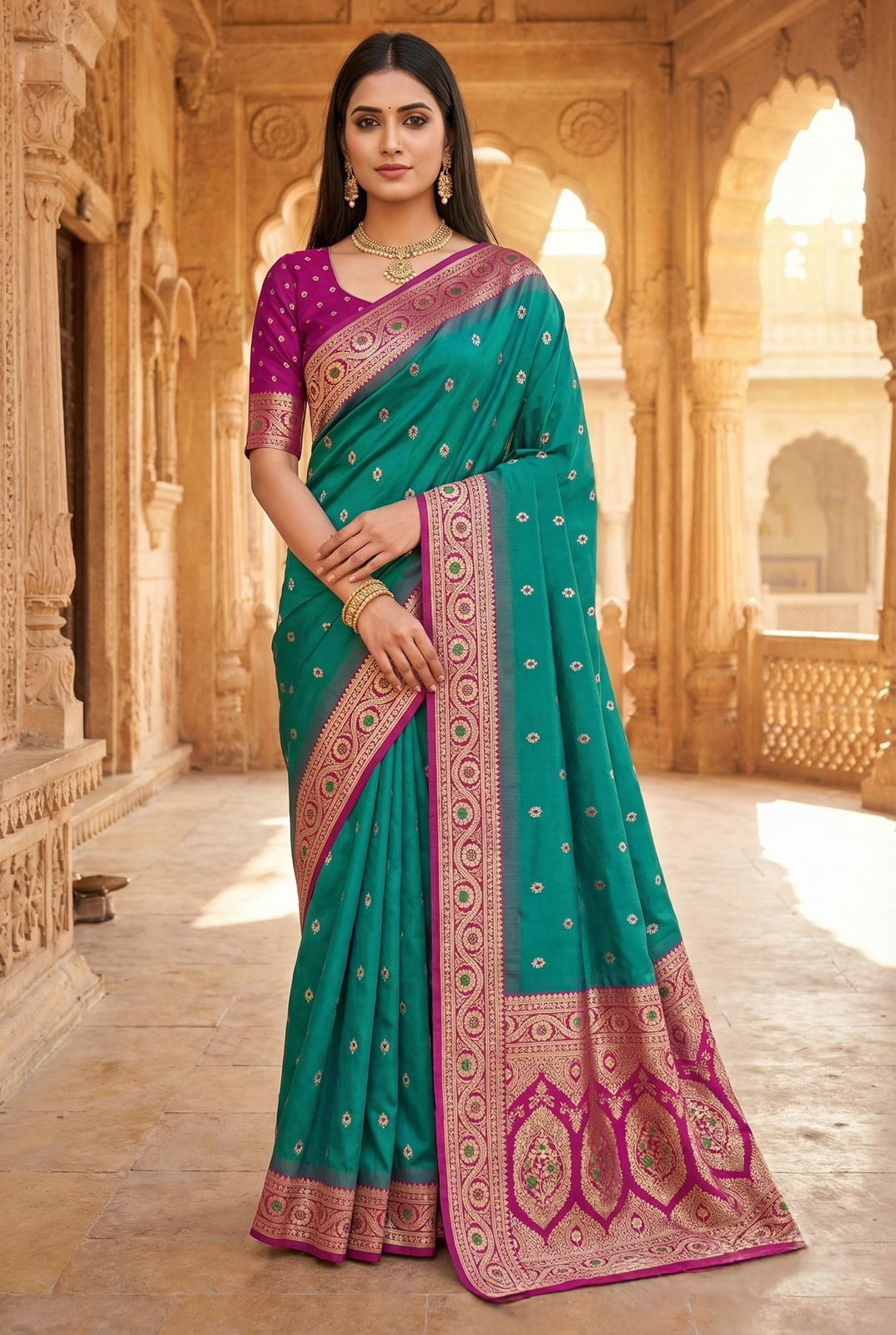 | Fabric Description | Saree :- Premium Soft Banarasi Silk With Zari Weaving All Over And Contrast Banarasi Border Woven With Traditional Paisley Motifs In Rich Gold Zari And Meenakari Woven Pallu | Blouse :- Contrast Matching Soft Silk Blouse Piece With Zari Woven Butti And Contrast Sleeve Border |