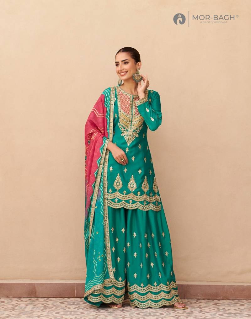 Aashirwad Mor Bagh The Aruna Chinon Silk Designer Salwar Suit Collection features premium Chinon silk fabric with elegant embroidery and contemporary detailing. Perfect for festive, party, and wedding occasions, this designer suit collection offers luxurious craftsmanship, rich colors, and a sophisticated ethnic look. Shop this graceful and stylish ensemble to elevate your traditional wardrobe with timeless elegance.