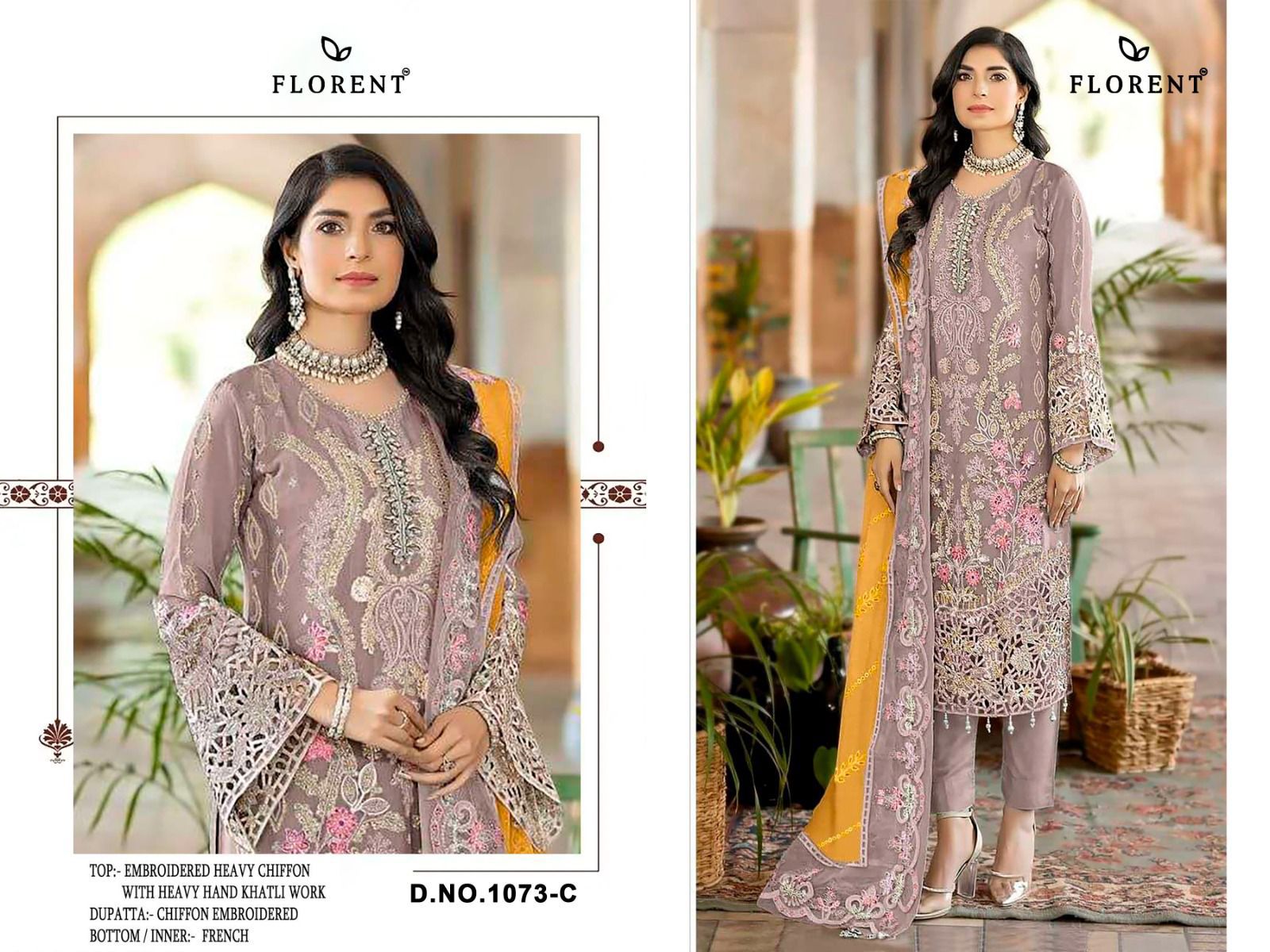 The Florent 1073 A To D Chiffon Pakistani Salwar Kameez collection features beautifully designed suits with attractive embroidery and elegant patterns. These suits are highly popular in the chiffon pakistani suits wholesale category due to their stylish appeal and versatile usage.