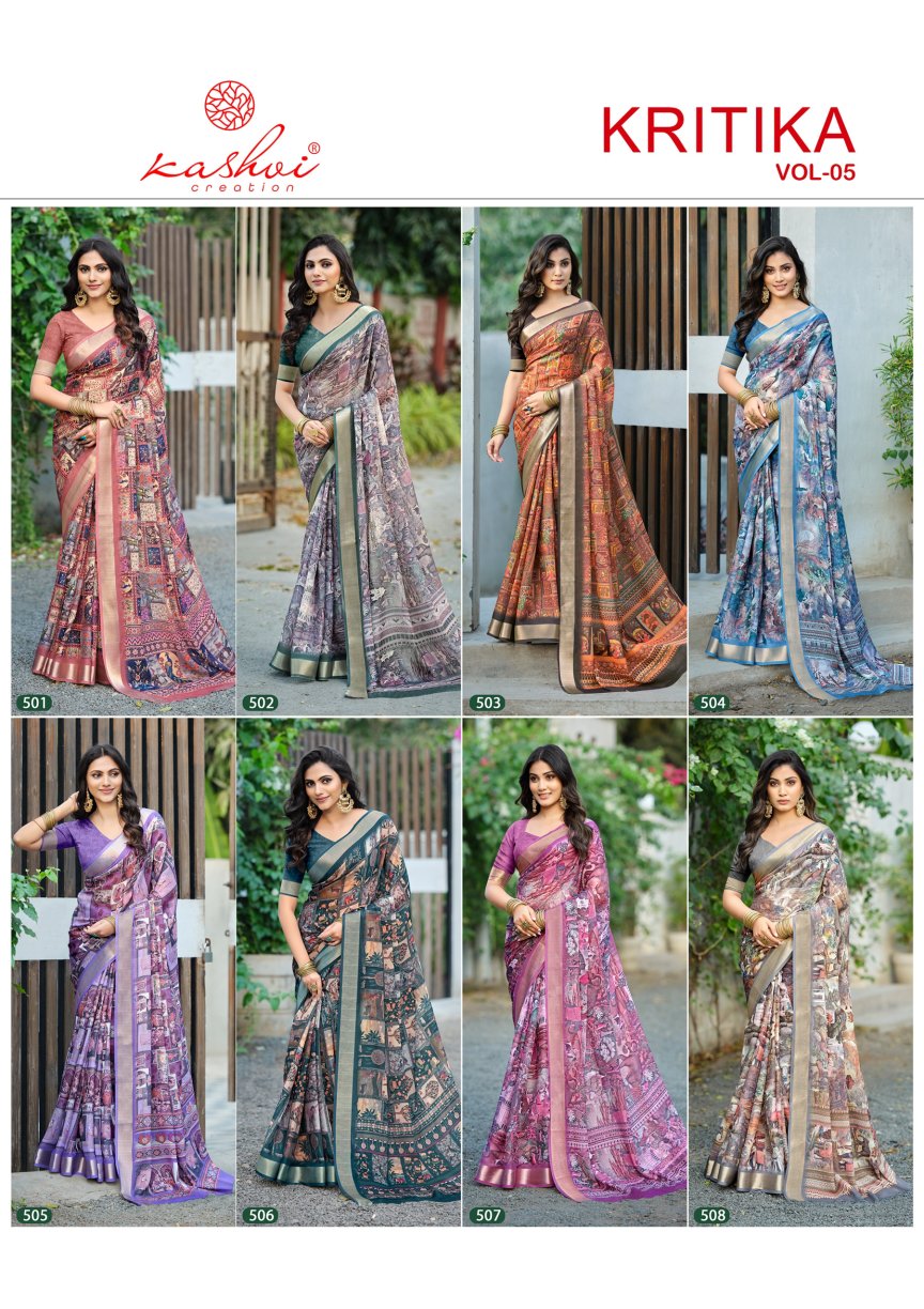 The Kashvi Kritika Vol 5 Dull Moss Printed Saree Collection features eye-catching prints, modern patterns, and elegant color combinations that suit a wide range of customer preferences. Retailers working as a trusted designer printed saree wholesale supplier can benefit from stocking this collection due to its growing demand among women of different age groups. The popularity of printed sarees continues to rise, making them a reliable category for consistent sales.