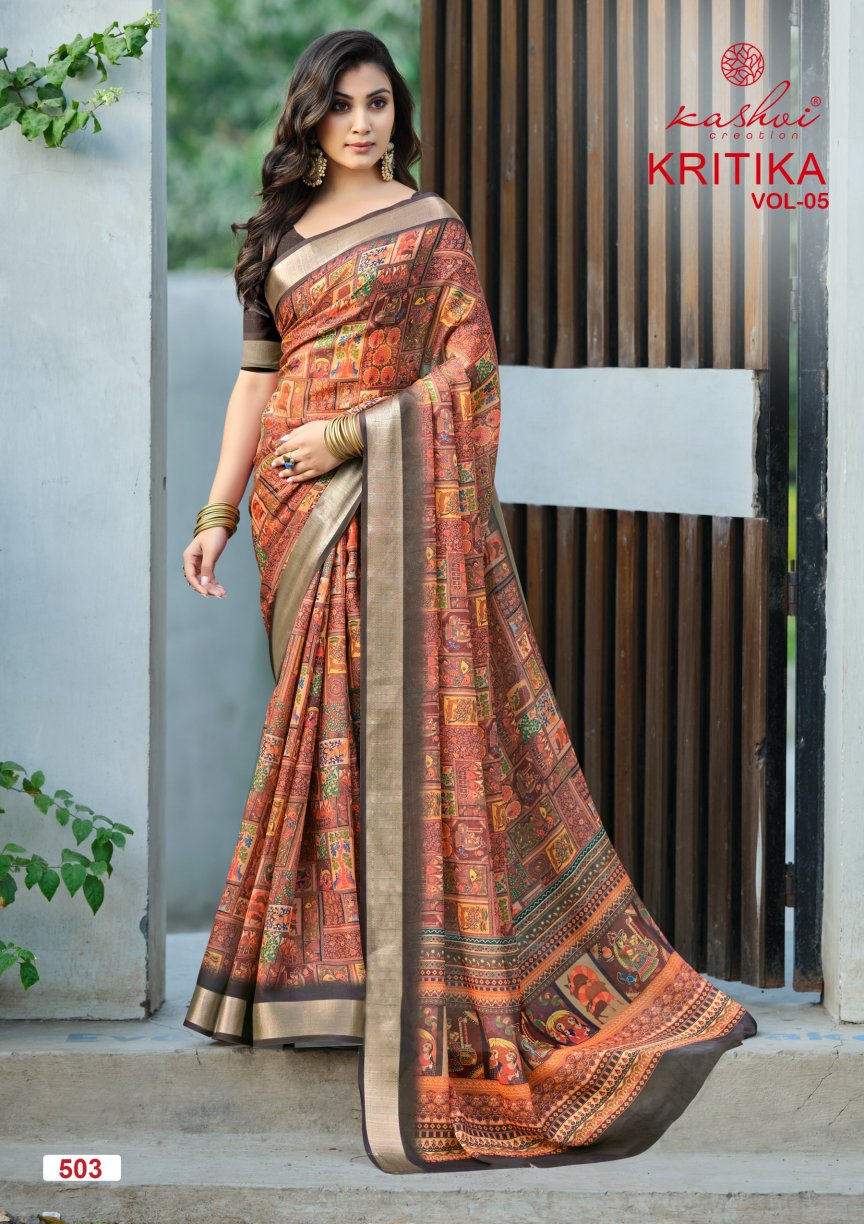 The Kashvi Kritika Vol 5 Dull Moss Printed Saree Collection is a perfect blend of elegance, comfort, and modern fashion. Printed sarees continue to dominate the ethnic wear market due to their versatility and stylish appearance. Retailers and wholesalers searching for premium saree collections at the best Printed Saree Wholesale Price will find this collection an excellent addition to their inventory.