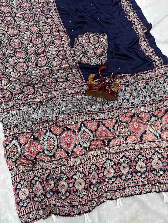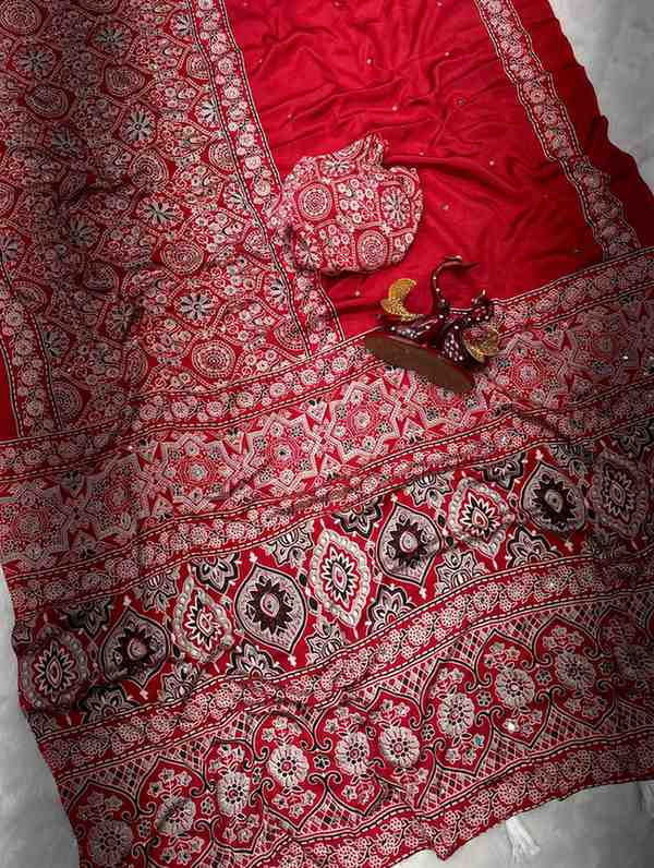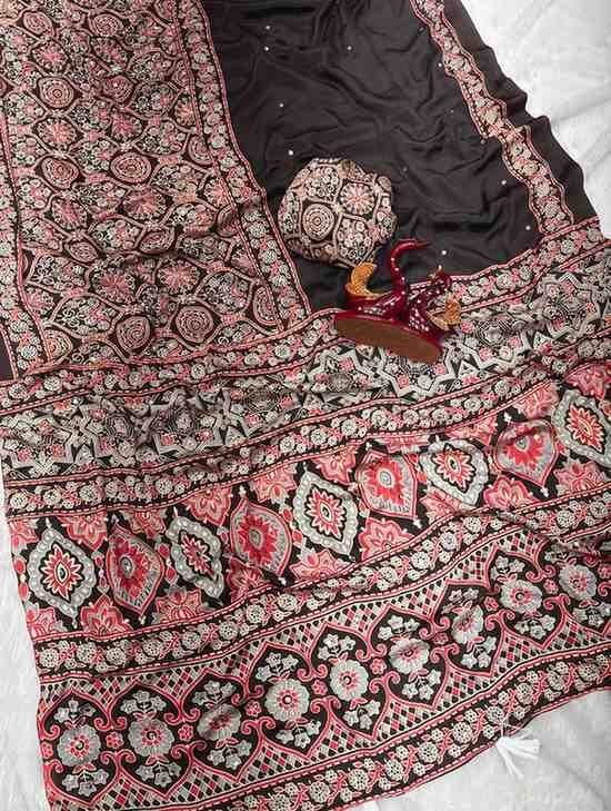 | Fabric Description | Saree fabric: Soft Cepe Silk | Work: Beautiful Ajarakh Print With Real Mirror Work And Beautiful Tassles | Blouse: Running |