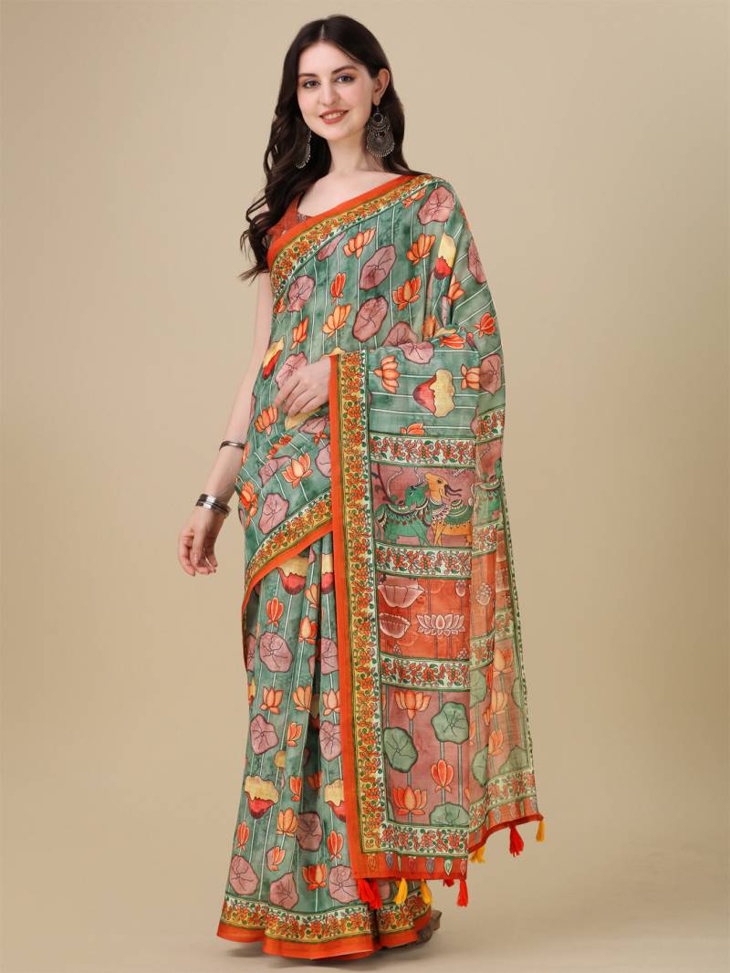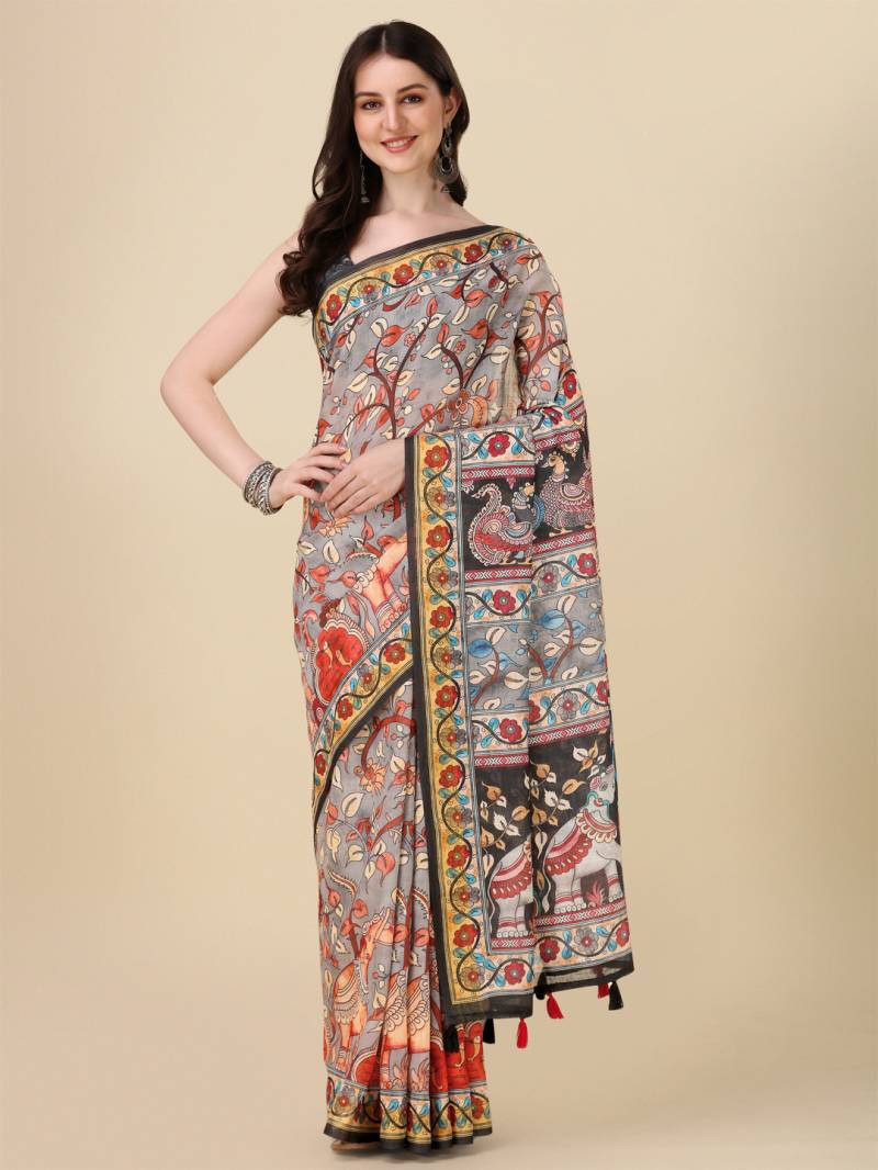 Elevate your ethnic wardrobe with our exquisite Designer Lilen Kalamkari Printed Saree Collection. Shop now for a touch of timeless elegance and tradition.