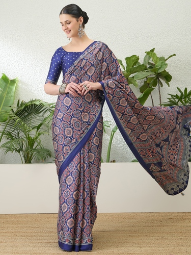 Elegant Ajrakh prints make these sarees suitable for office and professional settings.
