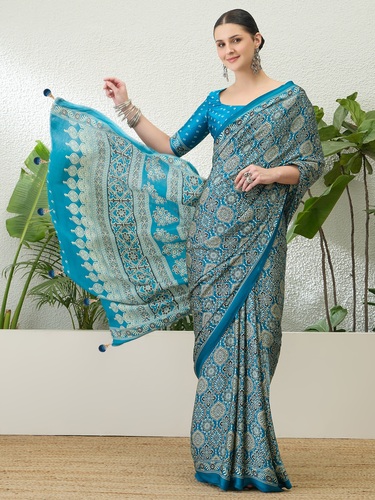 Ajrakh sarees remain popular across seasons due to their unique patterns and versatile styling options. Retailers sourcing at competitive printed ajrakh saree wholesale price rates can maintain steady sales.