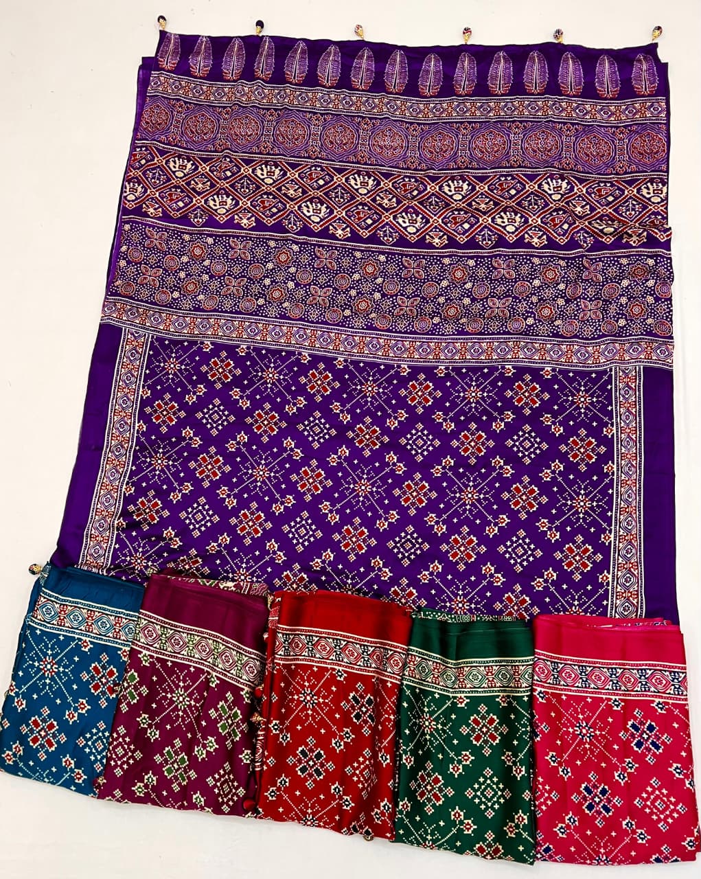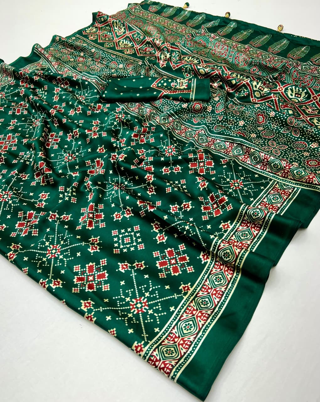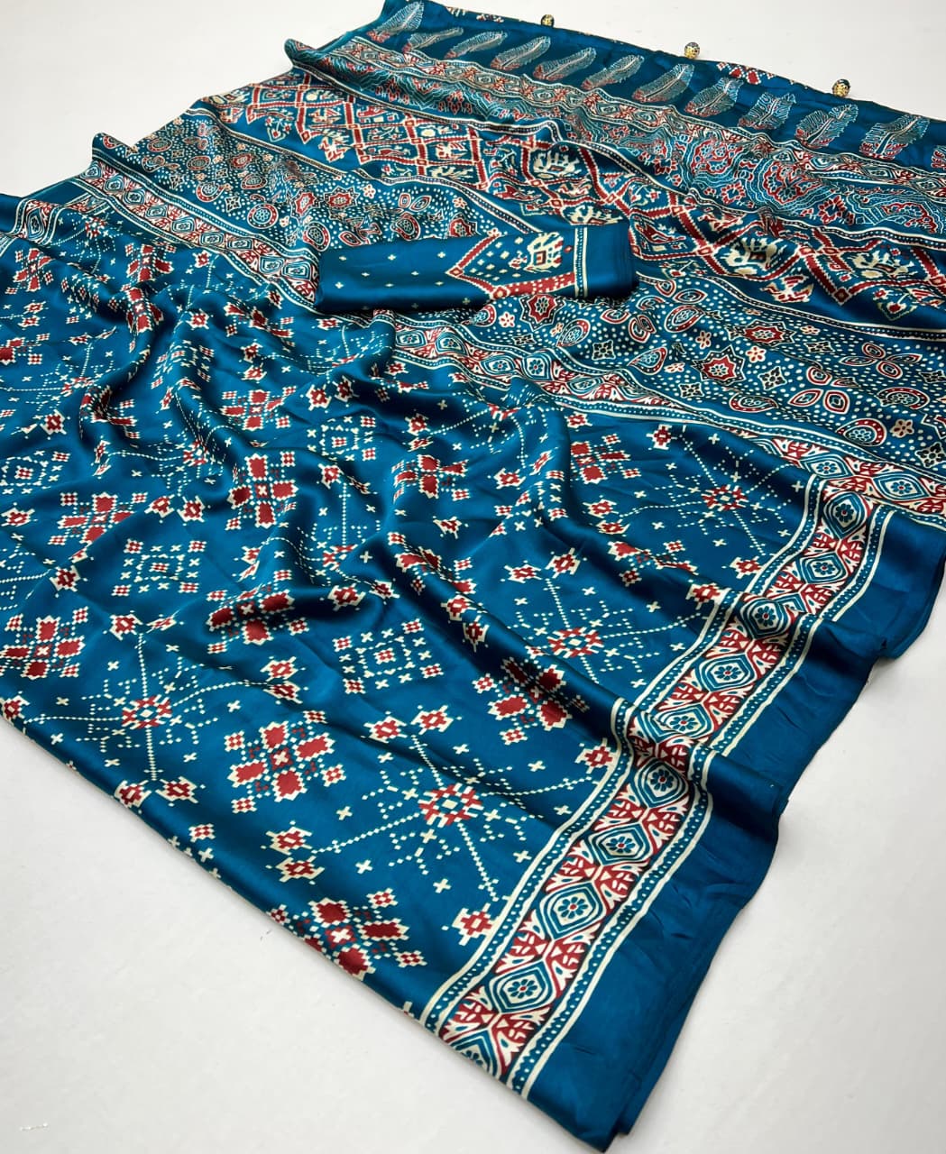 Each saree features beautiful Ajrakh-inspired patterns combined with Patola-style elements that highlight cultural heritage and artistic craftsmanship.