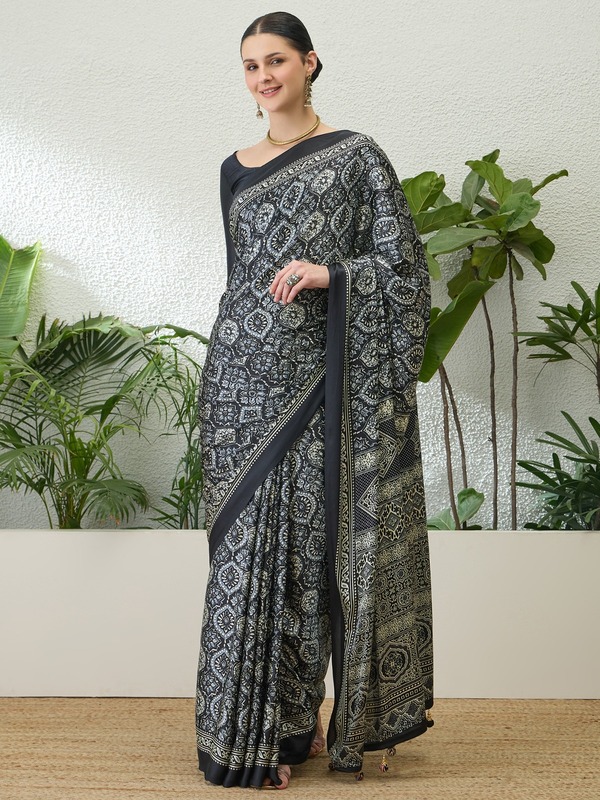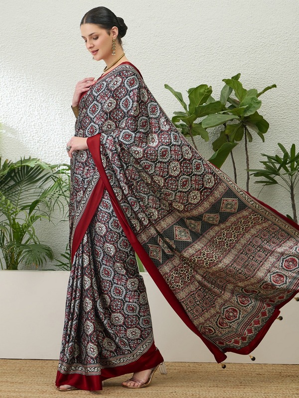 Semi modal fabric offers a smooth feel and lightweight comfort, making these sarees ideal for extended wear. Retailers offering products at a competitive Printed ajrakh sarees wholesale price in india can ensure customer satisfaction through high-quality fabric and stylish design.
