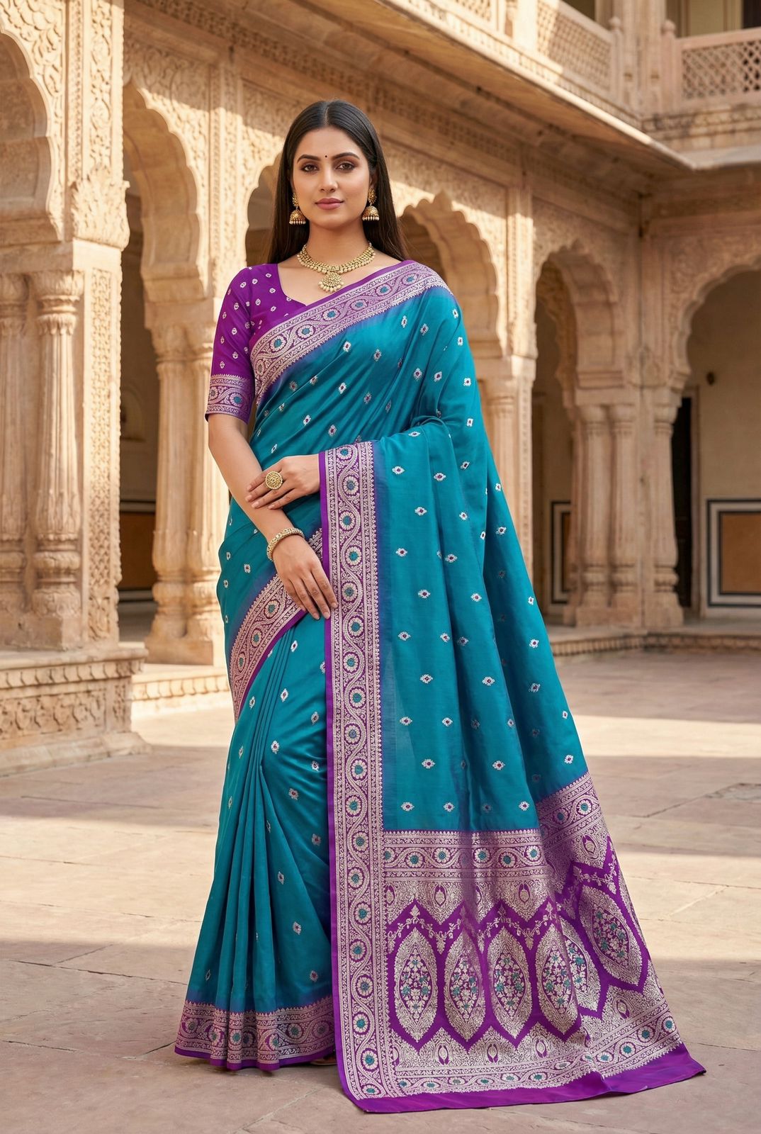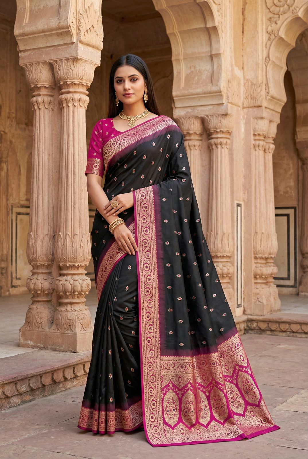 | Fabric Description | Saree :- Premium Soft Banarasi Silk With Zari Weaving All Over And Contrast Banarasi Border Woven With Traditional Paisley Motifs In Rich Gold Zari And Meenakari Woven Pallu | Blouse :- Contrast Matching Soft Silk Blouse Piece With Zari Woven Butti And Contrast Sleeve Border |