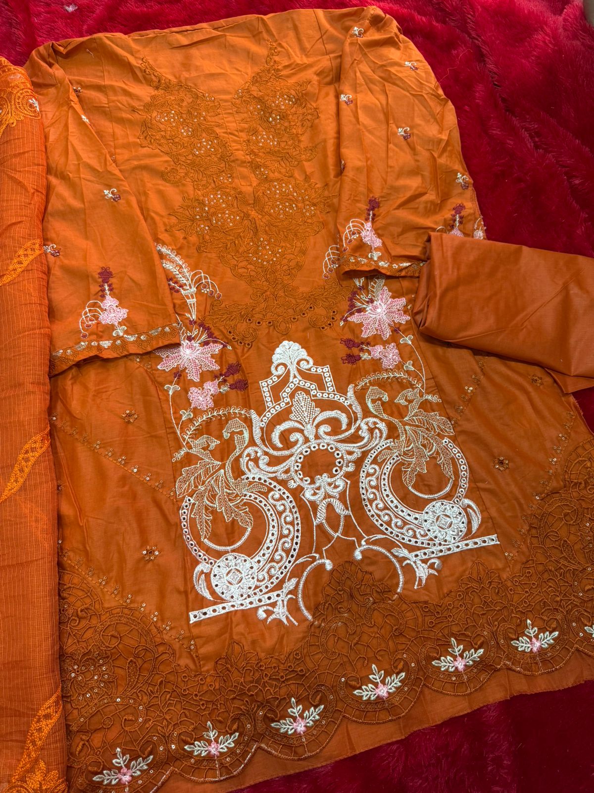 | Fabric Description | Top :- Pure Cotton With Self Embroidery Attached Embroidered Patches | Bottom :- Cotton Solid | Dupatta :- Kota Heavy Embroidery | [Pakistani Copy] |