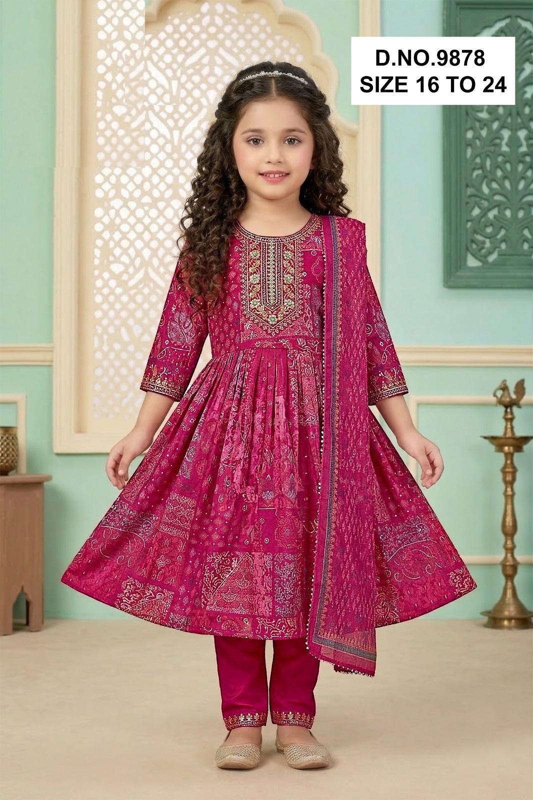 The Mishti 9878 Roman Glass Silk Kids Wear Kurti Set is an excellent choice for retailers, wholesalers, boutiques, and online sellers. Businesses sourcing at competitive Kids wear girls kurti wholesale price in india ranges benefit from offering fashionable kids wear collections that remain in high demand.