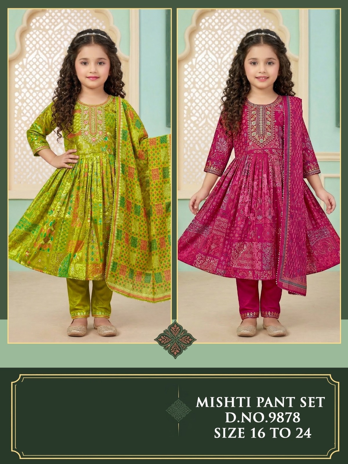 | Catalog Name | Mishti 9878 Roman Glass Silk Kids Wear Kurti Set |