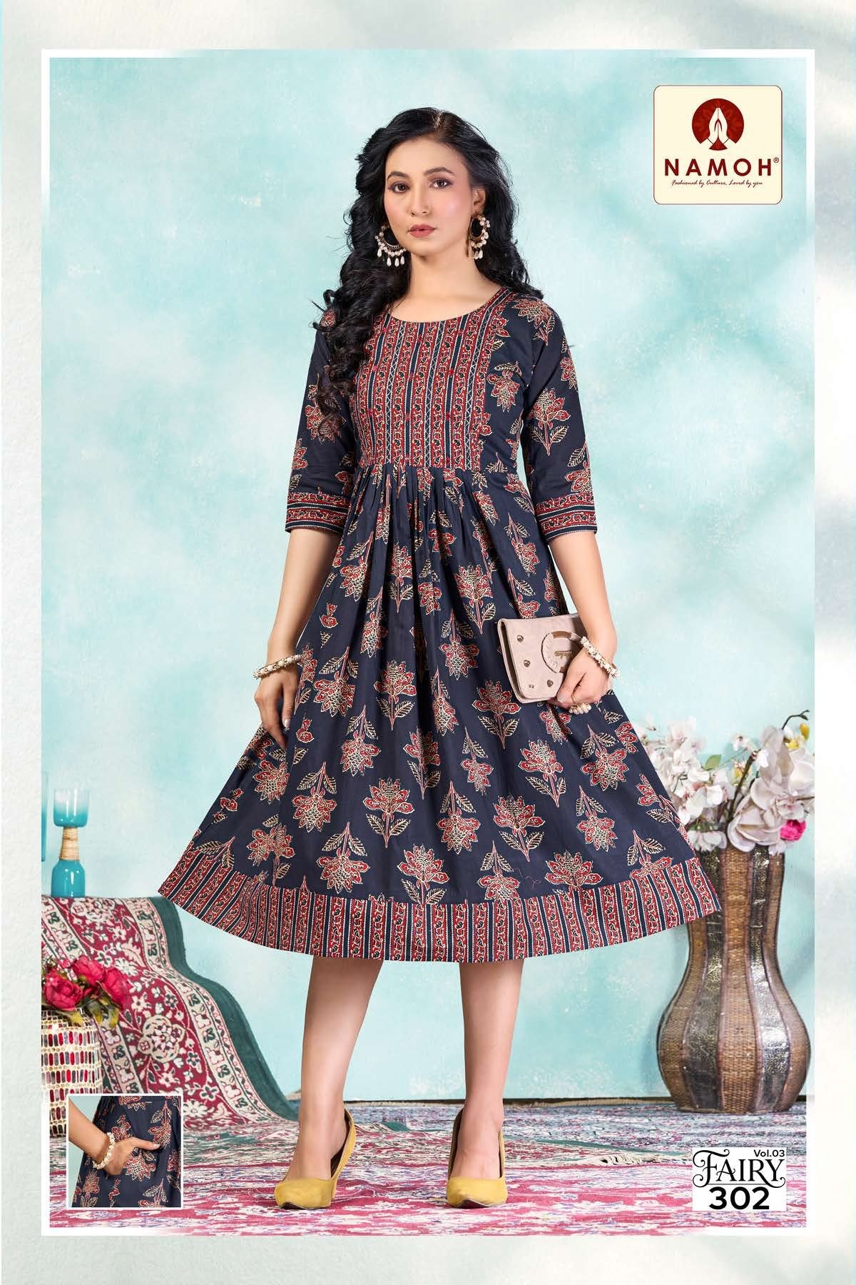 The Namoh Fairy Vol 3 Cotton Anarkali Kurti Collection features beautiful prints and attractive patterns that enhance the overall look of the garment. Retailers dealing in Anarkali Kurtis Wholesale Supplier India collections often select trendy printed kurtis that match current fashion trends.