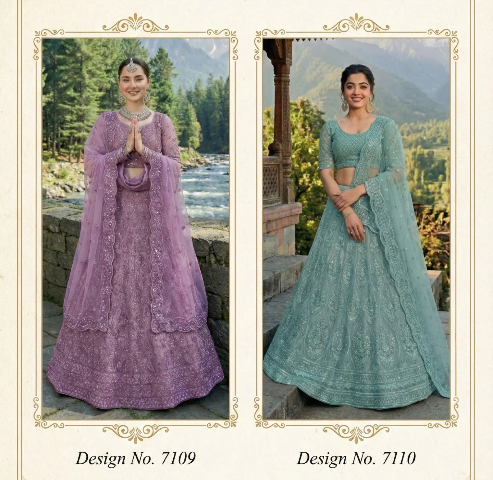 Designer lehenga choli manufacturers in Surat present Senhora Summer 7109 & 7110 net lehenga choli with heavy embroidery and sequence work. Perfect for ceremonial, wedding and party wear at wholesale price. Shop Now at FashionExport.