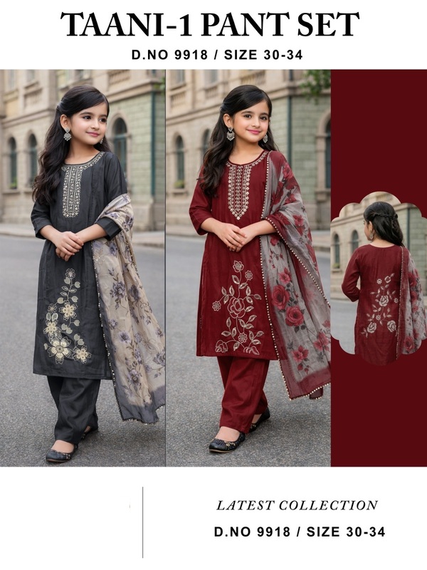 The Tanni 9918 And 9920 Roman Silk Kids Wear Kurti Set Collection features beautifully designed kurti sets that are both trendy and traditional. Customers exploring kids wear wholesale & traders in malaysia collections often prefer coordinated outfits that are easy to style.