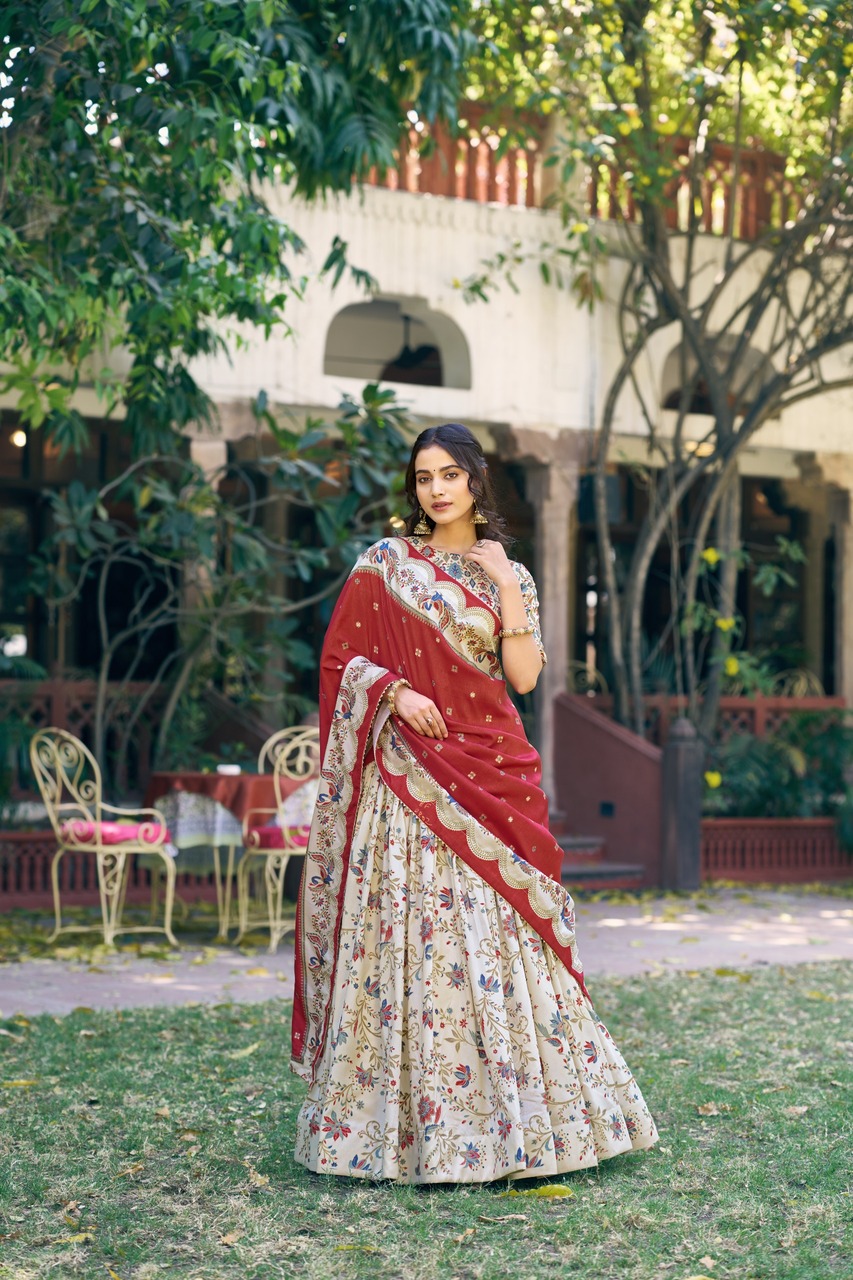 The Taraa L 1256 Tasar Silk Foil Printed Lehenga Choli Collection provides versatile styling possibilities for different occasions.