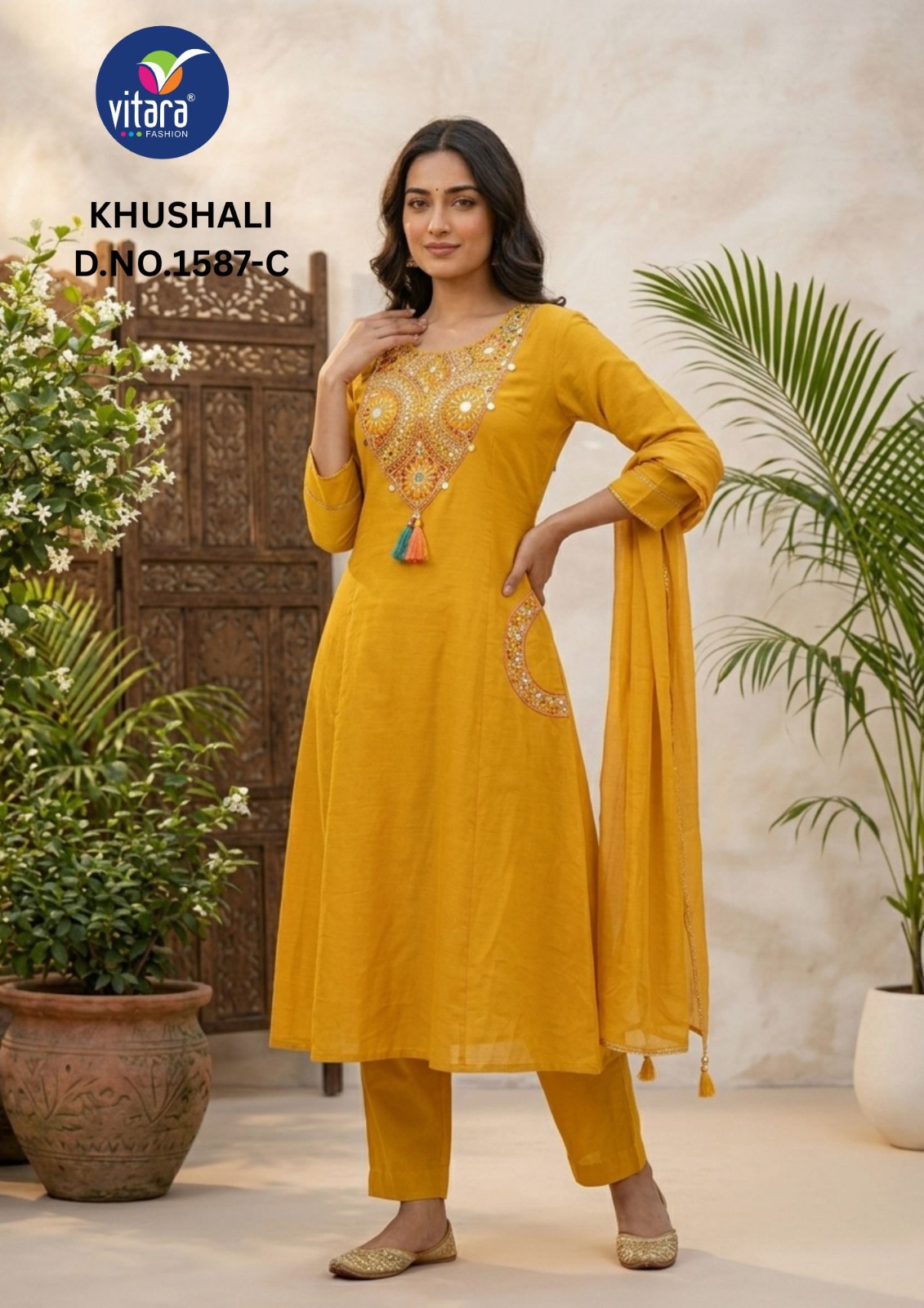 Retailers and boutique owners always look for trendy collections that offer consistent market demand. The Vitara Khushali Cotton Embroidery Neck Work Kurti With Bottom Dupatta Collection is suitable for boutiques, garment shops, and online resellers. Buyers sourcing from Embroidery work kurti set wholesale price collections often select fashionable designs that sell quickly.