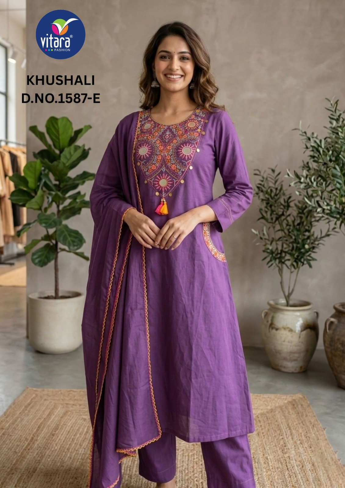 Kurti sets with embroidery work continue to remain one of the most demanded categories in ethnic wear. Buyers sourcing from Embroidery work kurti set wholesale price collections often look for outfits that combine comfort with stylish finishing. The Vitara Khushali collection perfectly meets these requirements with its attractive embroidery and soft cotton fabric.