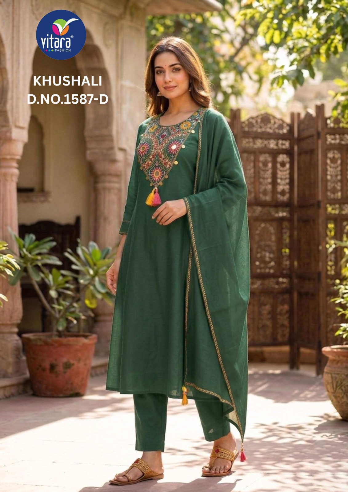 The Vitara Khushali Cotton Embroidery Neck Work Kurti With Bottom Dupatta Collection is designed for daily wear, office wear, festive occasions, and family gatherings. Customers can pair this outfit with stylish accessories and footwear to enhance their overall look.