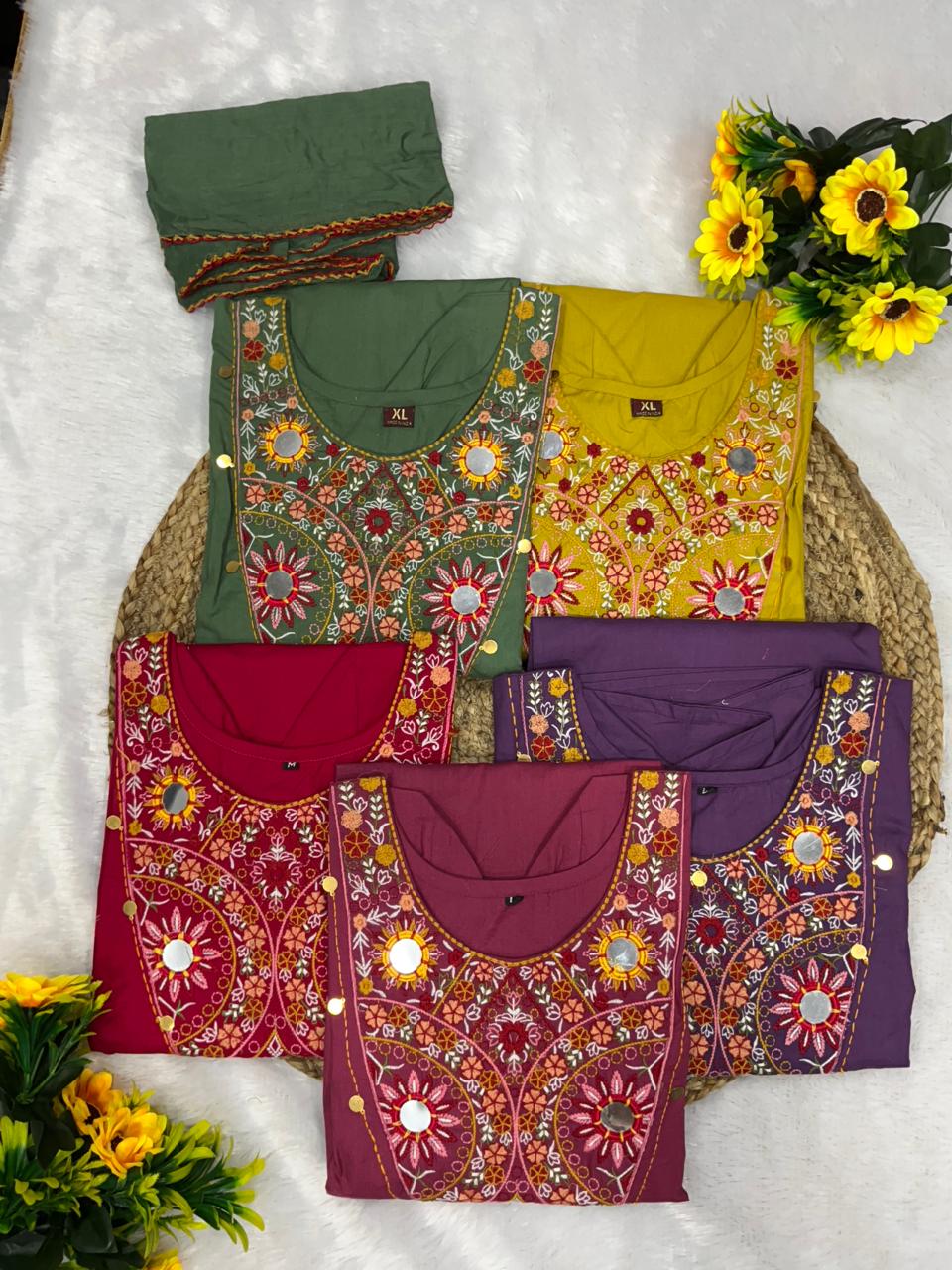 The Vitara Khushali Cotton Embroidery Neck Work Kurti With Bottom Dupatta Collection includes a kurti, matching bottom, and dupatta, forming a complete ethnic outfit. Retailers offering Embroidery work kurti set wholesale price collections benefit from complete sets because they provide ready-to-wear convenience for customers.