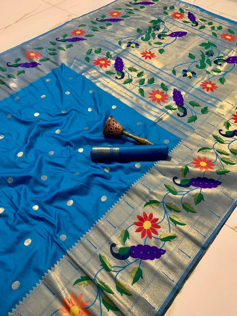 | Fabric Description | Saree :-Pure Soft Kanchivram Paithani Silk Original Pure Zari Brocket Design And Minakari Border And Heavy Mina Zari Weaving | Blouse :-Plain With Zari Border | Length:-5.50 Mtr Saree And 0.90mtr Blouse |