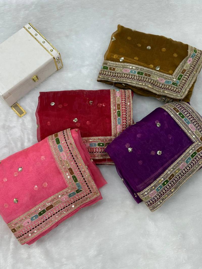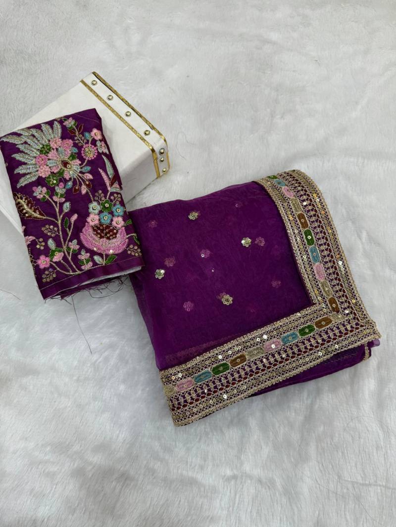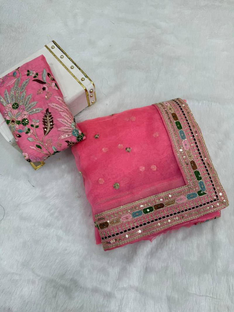 | Fabric Description | Organza || Saree ; Soft Organza Silk With Multi Thread And Sequence Embroidery Lace Border All over Saree (5.50 Mtr Approx ) | Blouse : Stin Banglori Silk With Embroidery Work Butta (0.80 Mtr Approx ) |