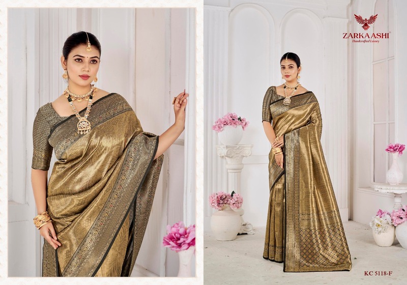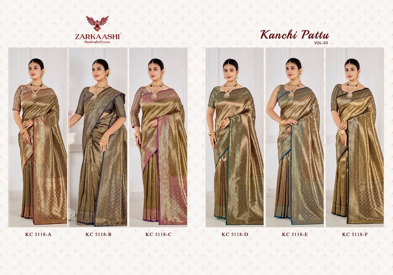 Zarkaashi Kanchi Pattu Vol 02 The Traditional Banarasi Zari Saree Collection features rich craftsmanship with luxurious Banarasi zari work and premium Kanchi pattu fabric. These sarees showcase elegant traditional designs, intricate weaving, and a graceful finish—perfect for weddings, festive occasions, and cultural celebrations. Ideal for boutiques and resellers, this collection is available at wholesale prices with worldwide shipping. A timeless blend of tradition, elegance, and royal charm for modern women.
