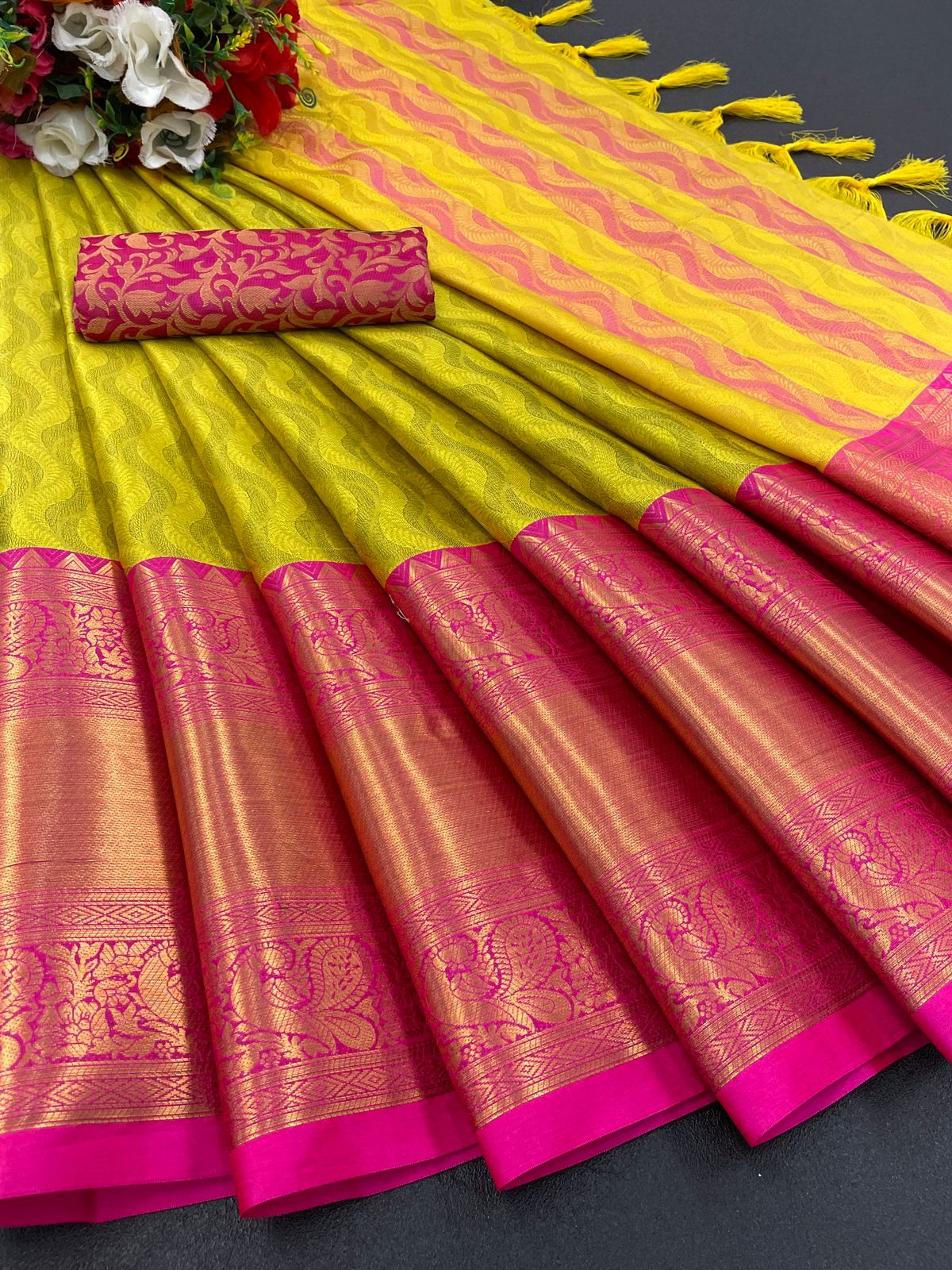 | Fabric Description | Cotton silk || Fabric: Pure Mercerised Cotton Silk | Saree: 5.5 MTR | Blouse: 0.80 MTR | Contrast Matching Blouse With Contrast Pallu |
