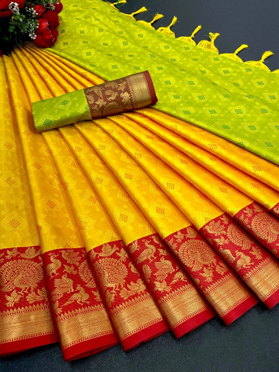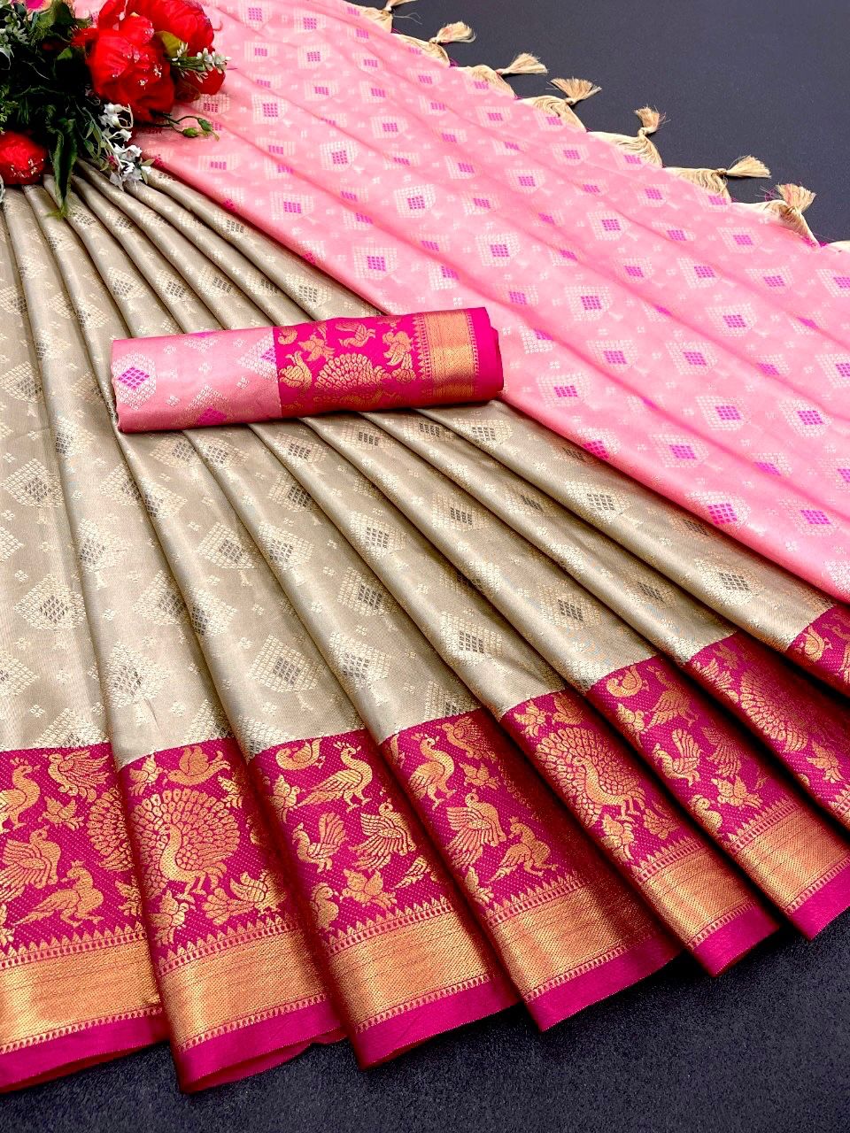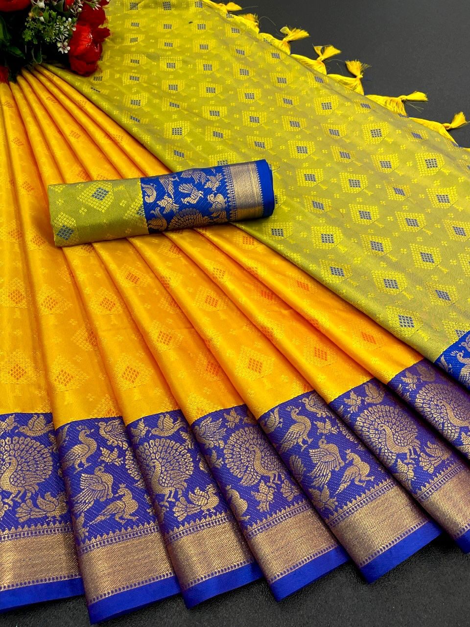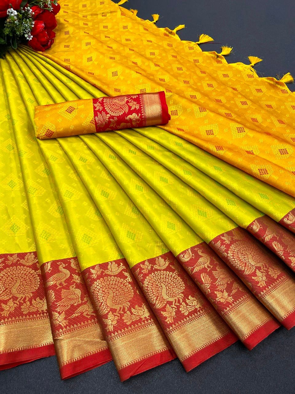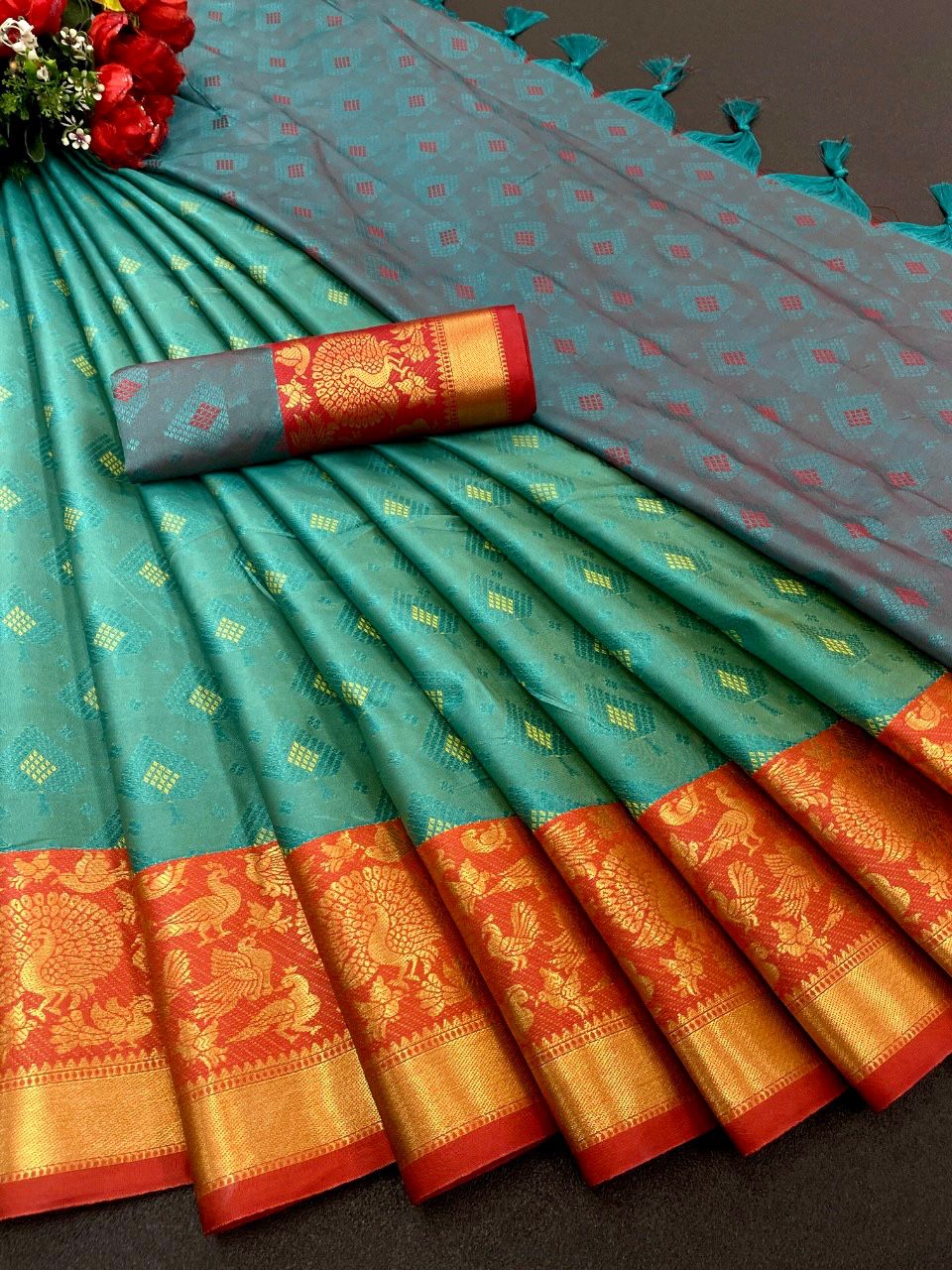 | Fabric Description | Silk || Mercerised Kanchivaram Silk in Exclusive Border Design Zari Checks | Blouse : Jacquard Soft Silk |