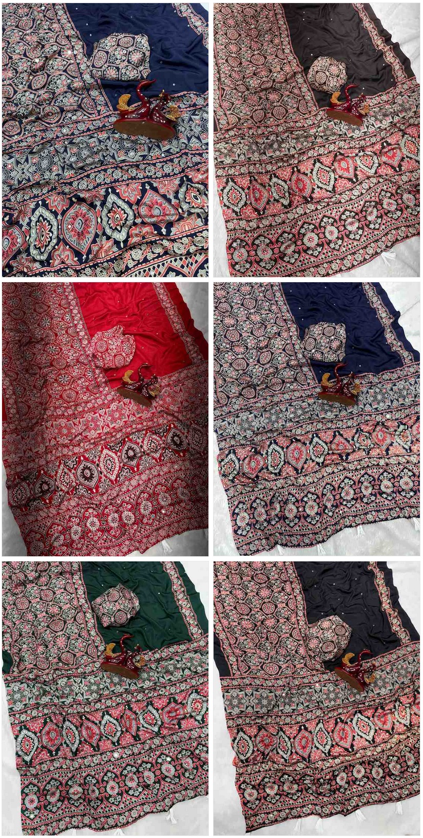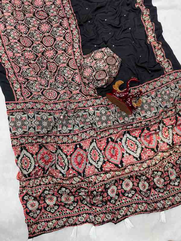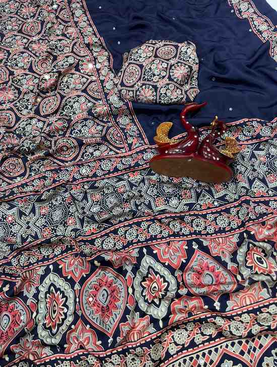 | Fabric Description | Saree fabric: Soft Cepe Silk | Work: Beautiful Ajarakh Print With Real Mirror Work And Beautiful Tassles | Blouse: Running |