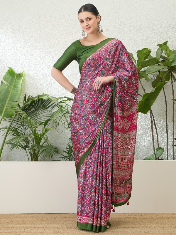 Semi modal fabric offers a smooth feel and lightweight comfort, making these sarees ideal for extended wear. Retailers offering products at a competitive Printed ajrakh sarees wholesale price in india can ensure customer satisfaction through high-quality fabric and stylish design.