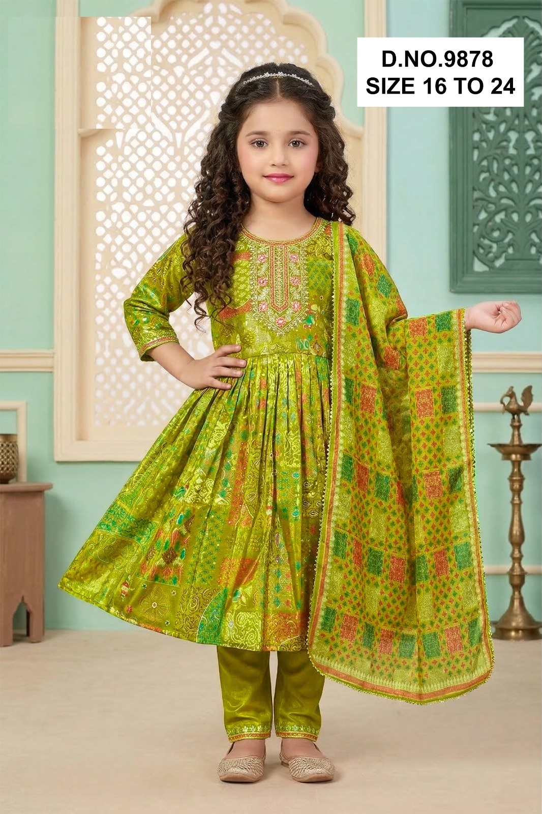 The Mishti 9878 Roman Glass Silk Kids Wear Kurti Set is ideal for festive celebrations, weddings, birthday parties, and cultural events. Retailers sourcing products at the best Kids wear girls kurti wholesale price in india benefit from versatile outfits suitable for multiple occasions.