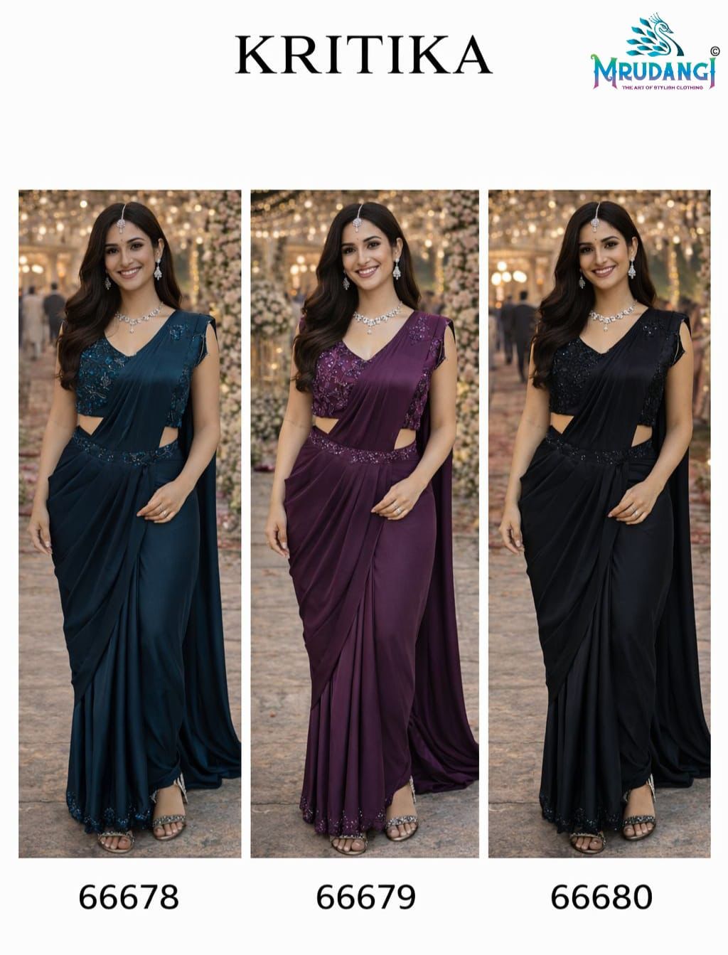 The Mrudangi Kritika Lycra Ready To Wear Party Wear Saree collection allows customers to create elegant looks effortlessly. Retailers promoting products available at the best Ready To Wear Saree Wholesale Price can use these styling ideas to inspire buyers.