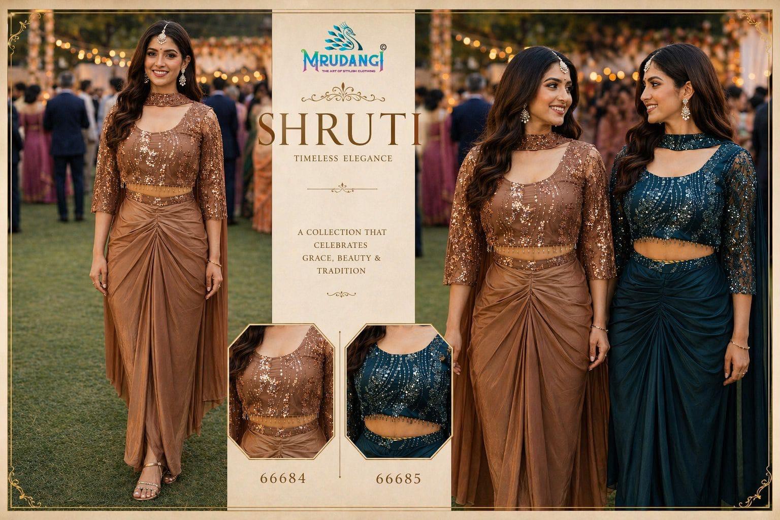 Indo Western sarees have become increasingly popular among young customers and fashion enthusiasts. These outfits combine the grace of sarees with the convenience of modern styling, making them suitable for parties, receptions, and festive events. The Mrudangi Shruti collection reflects the latest fashion trends while maintaining comfort and versatility.