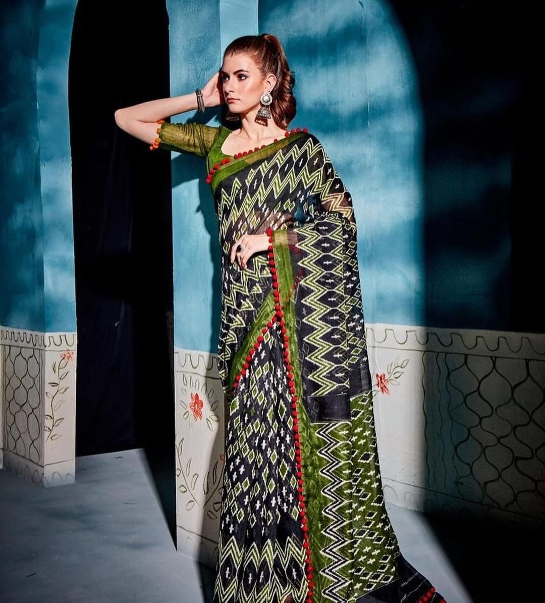 | Fabric Description | Cotton || Imported Cotton Pochampally Style Printed Overall Pompom & Running Blouse (6.40 Metre) |