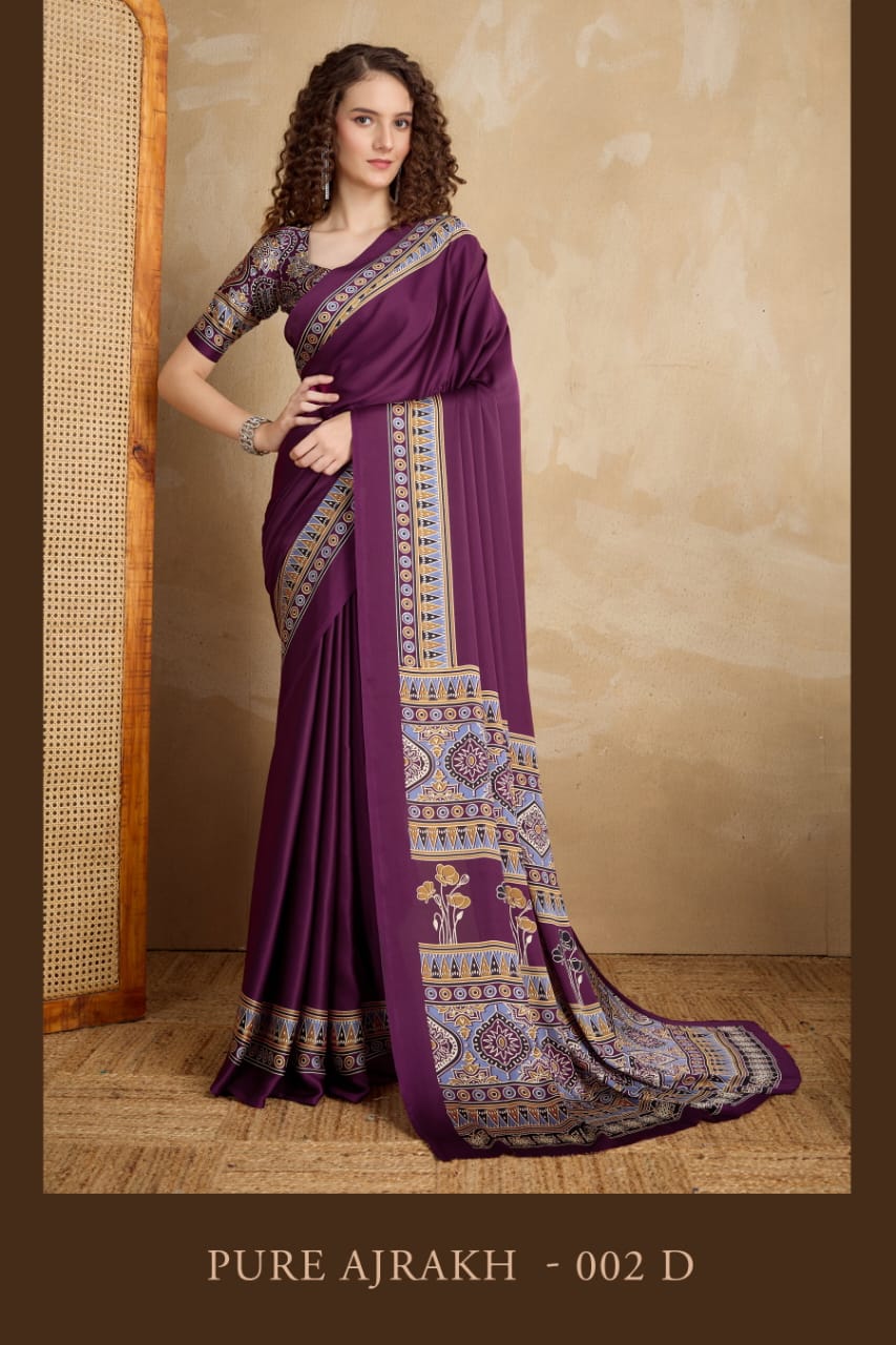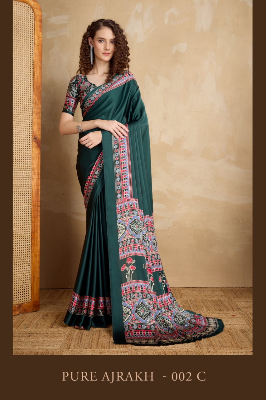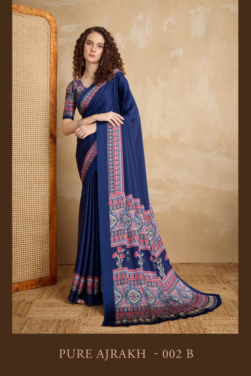 The Pure Ajrakh 002 A To E Ajrakh Printed Saree Collection is a beautiful blend of traditional craftsmanship and modern fashion. This collection showcases elegant Ajrakh-inspired prints that highlight cultural heritage while maintaining contemporary style. Retailers and boutique owners searching for the best printed ajrakh saree wholesale price options will find this collection highly suitable for their inventory. The popularity of printed ajrakh saree wholesale price collections continues to increase as customers look for ethnic designs that reflect tradition and style.