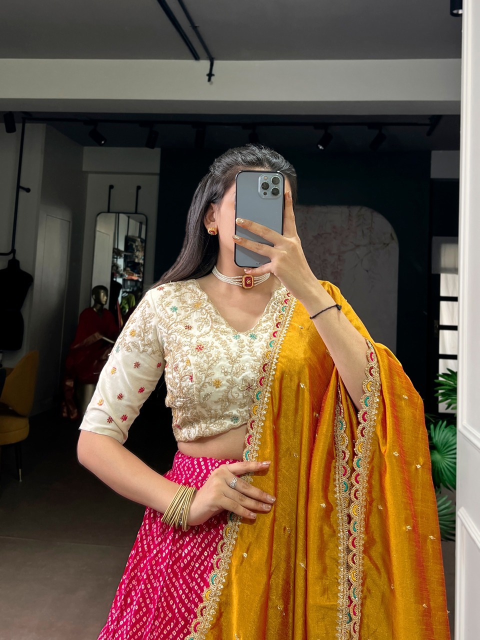 This collection is crafted using high-quality silk fabric that adds richness and elegance to every outfit. Silk is known for its smooth texture, natural sheen, and luxurious appeal, making it perfect for special occasions. The fabric drapes beautifully, enhancing the overall look of the lehenga choli.