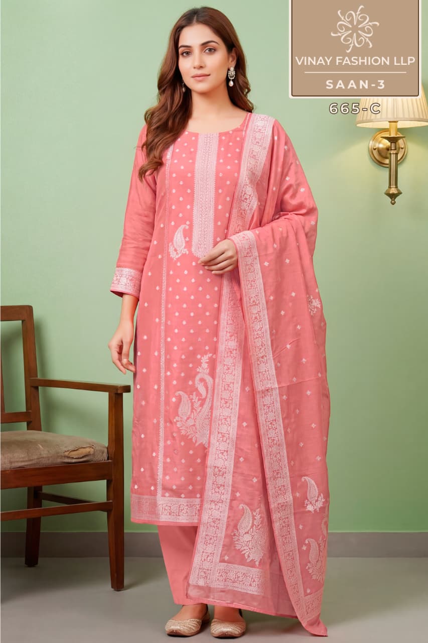 The Vinay Kuleesh Saan Vol 3 Viscose Salwar Kameez Collection combines comfort, elegance, and modern design, making it a strong addition to any ethnic wear collection. With premium viscose fabric and trendy patterns, this collection meets the expectations of customers looking for stylish and comfortable outfits.