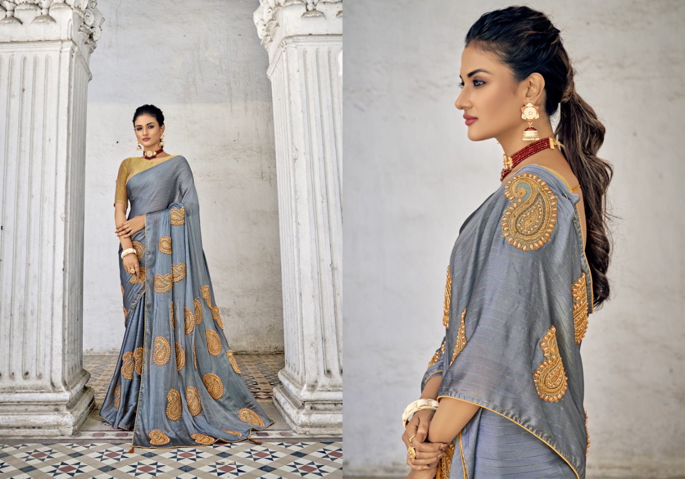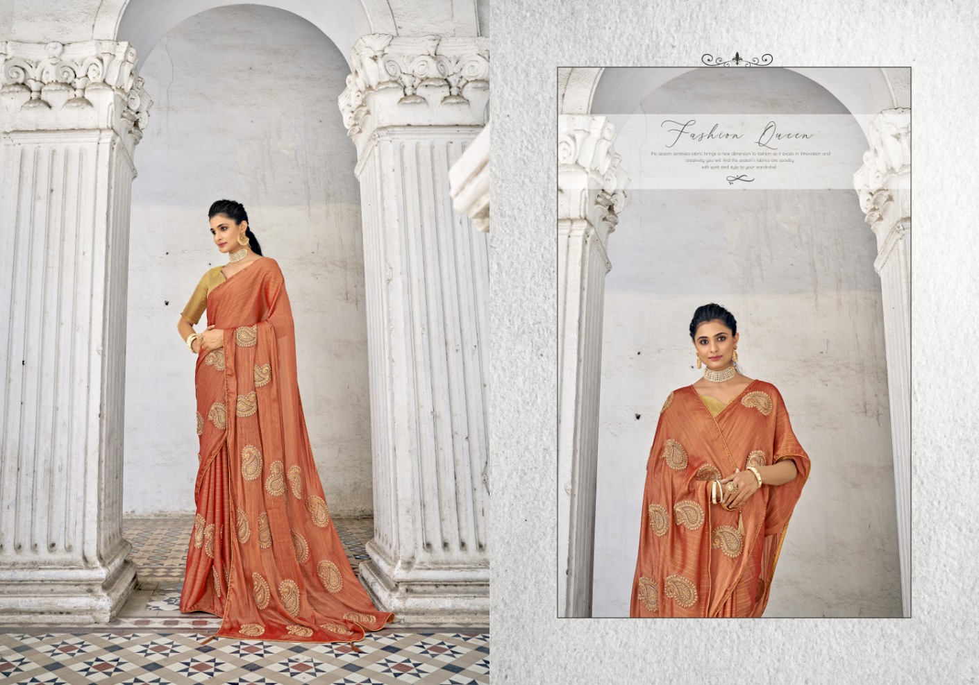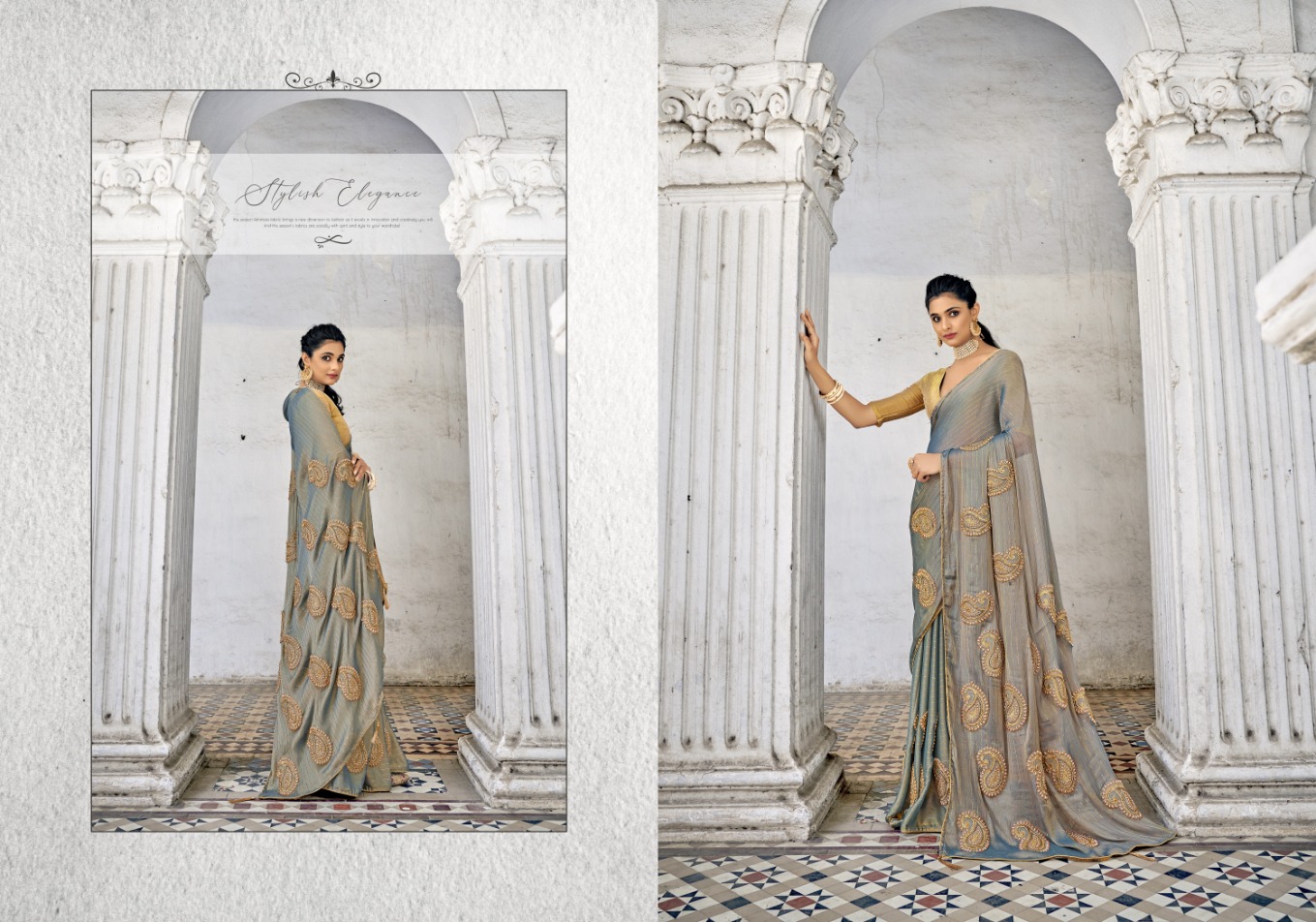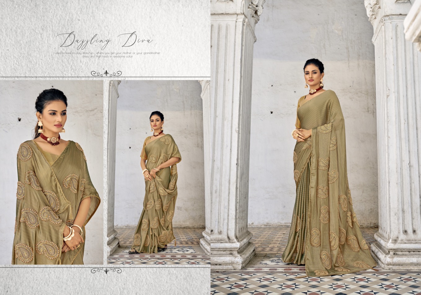 What sets this collection apart is the fusion of delicate details and chiffon's ethereal drape. The embroidery work ranges from subtle elegance to bold embellishments, creating patterns that add depth and dimension to the saree. The chiffon fabric's lightweight nature enhances the elegance, ensuring that you move with grace and poise.